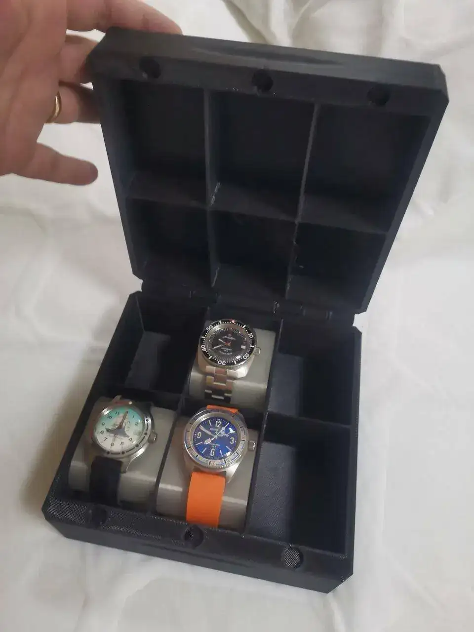 Al postdata:Mola la caja, hace unos días justamente me imprimi unos soportes para los relojes qué más utilizo.