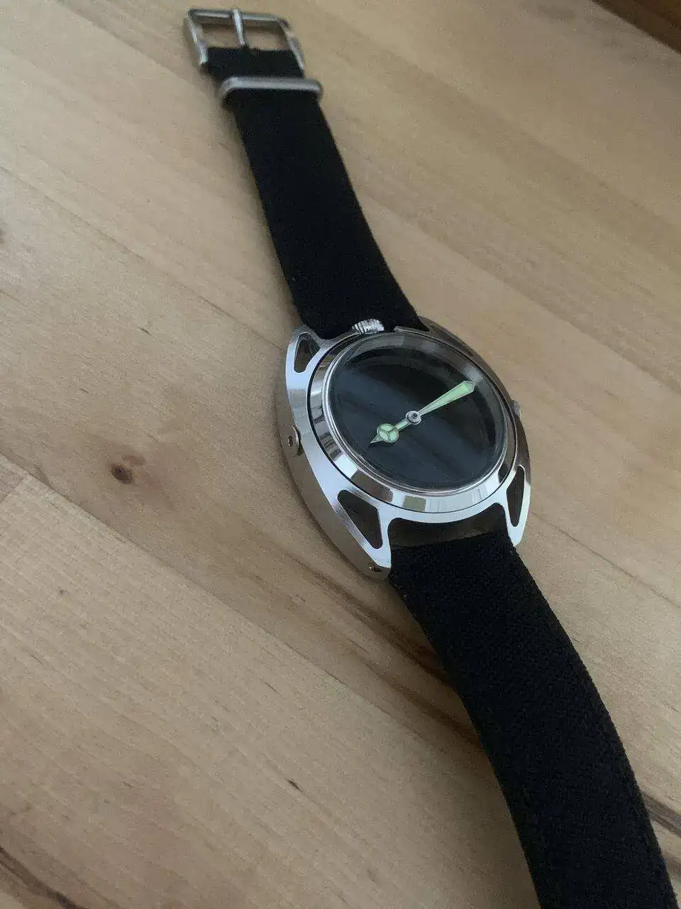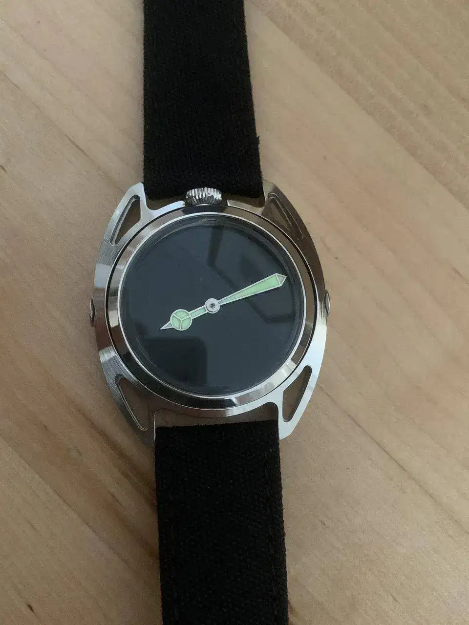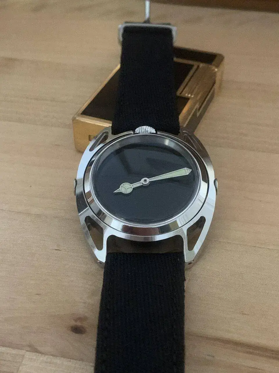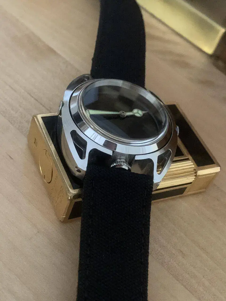 hoy os presento una caja mejor armonizada (en cuanto a radios y acabados) que la última que presenté. También para el mismo módulo NH-38 y con ambas partes en acero inoxidable. Hice un dial y lo pinté en negro semi mate. La correa cordura negra gentileza de Manel Alabart. Saludos y espero que sea de vuestro agrado.