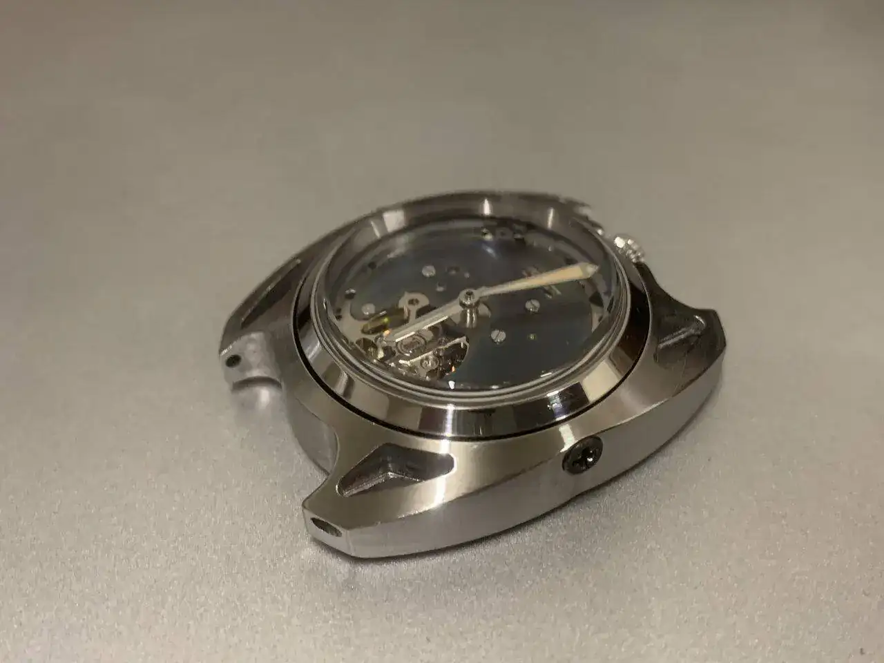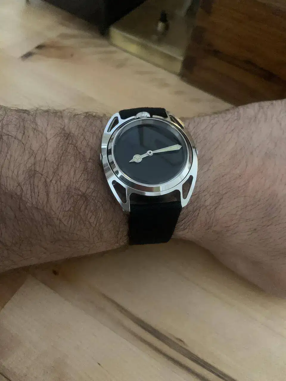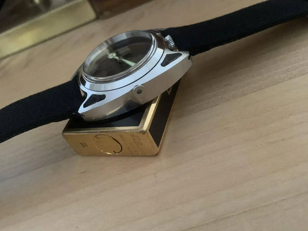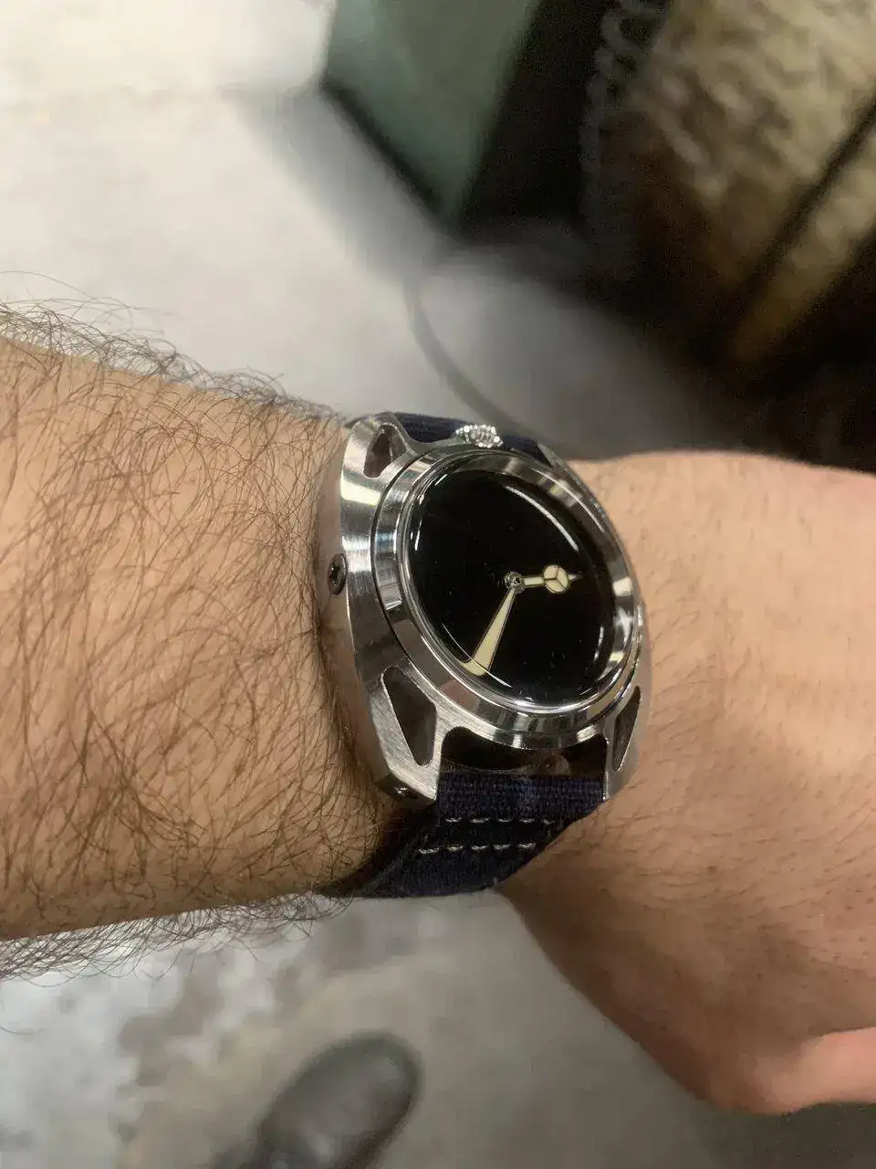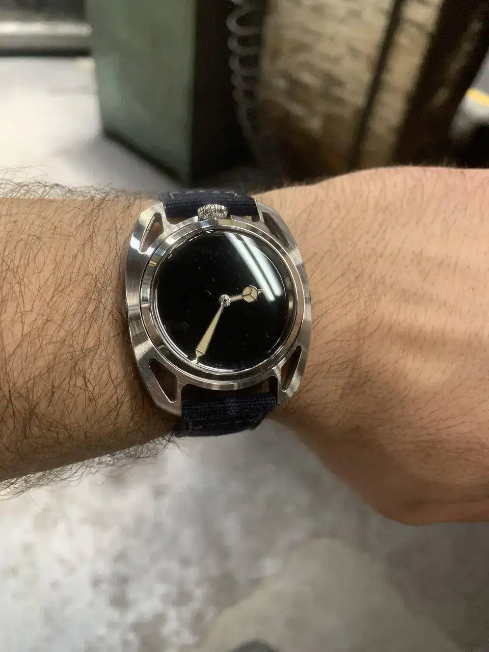 hoy os presento una caja mejor armonizada (en cuanto a radios y acabados) que la última que presenté. También para el mismo módulo NH-38 y con ambas partes en acero inoxidable. Hice un dial y lo pinté en negro semi mate. La correa cordura negra gentileza de Manel Alabart. Saludos y espero que sea de vuestro agrado.