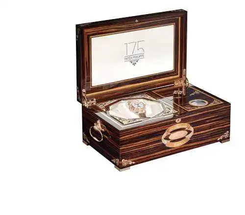 os dejo una foto de una un tanto especial, está fabricada en madera de ébano de Makasar y otras 17 maderas preciosas y ornada con inserciones de oro, esta caja custodia un PP Grandmaster Chime referencia 5175, y que se creó para el aniversario 175 de la marca. Os animo a mostrar las cajas de vuestros guardatiempos.