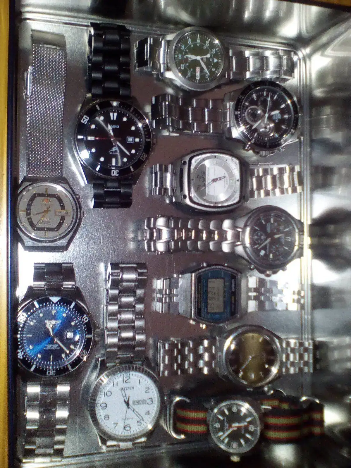 Todos los relojes se encuentran en perfecto funcionamiento y son usados conforme a la "necesidad" del dueño, aunque mi favorito por tamaño y comodidad es el que aparece como segundo arriba a la derecha, el Orient automático que se encuentra entre el Lucerne de cuerda y uno de los primeros Casio "marlines".