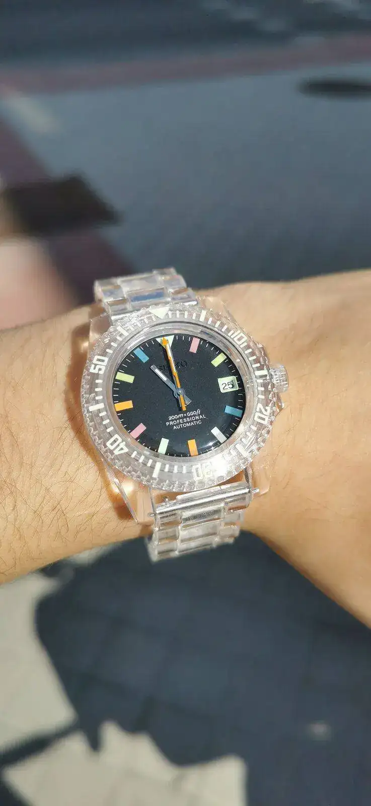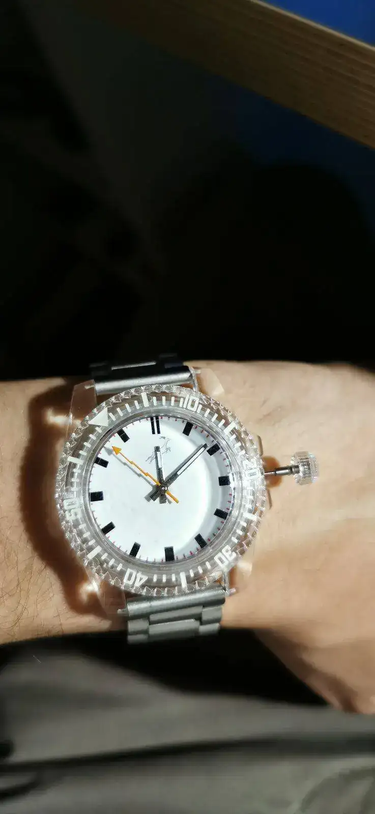 La caja va a durar 2 telediarios... Es plástico blandito y está claro que se va a rayar al primer toque. Eso si, se pulirá fácil con polywatch o similar. Sospecho que al primer toque gordo las barras del armís astillarán la caja y ahí se acabó la juerga... Pero bueno no pasa nada porque mientras no me cargue el bisel, la versión sin lumen de esta caja vale 6€. Esta que es la que trae el bisel con lumen son 16 pavos creo recordar. Son idénticas salvo por el lumen del bisel, así que si muere compraré una de las baratas y le traspasaré el bisel molón.