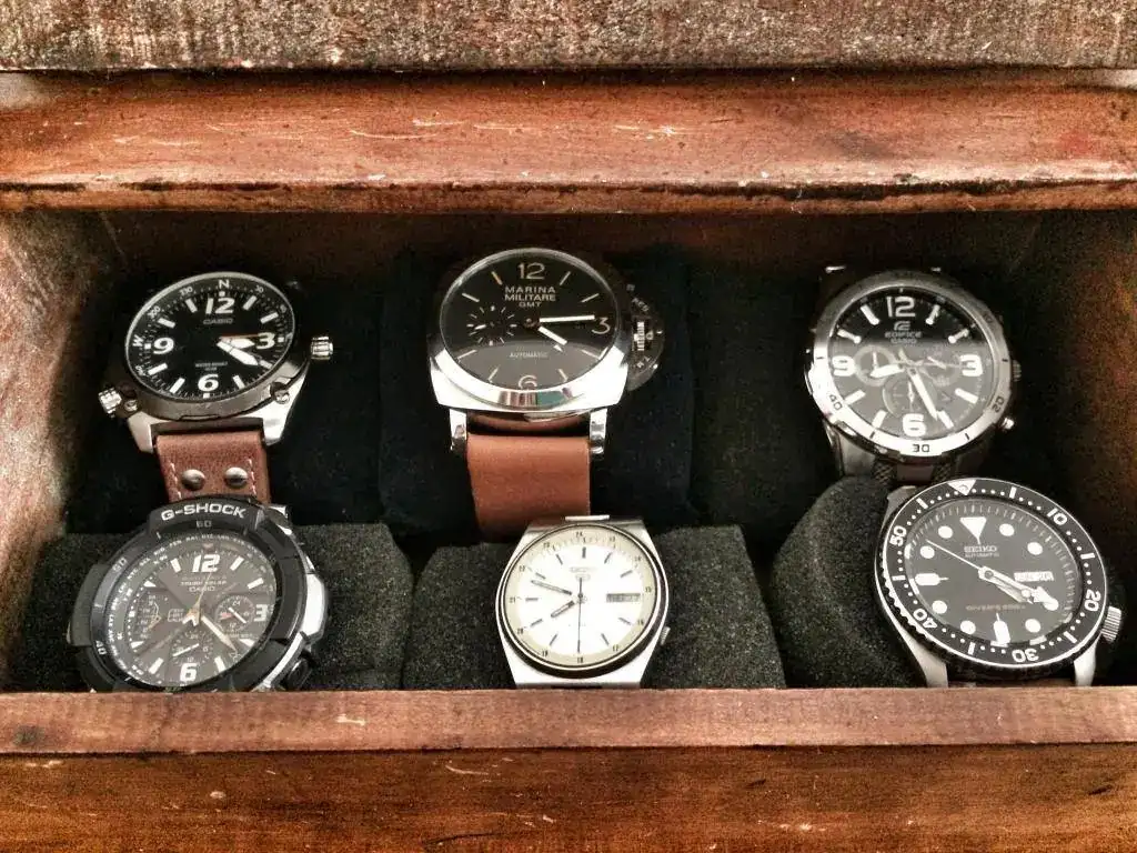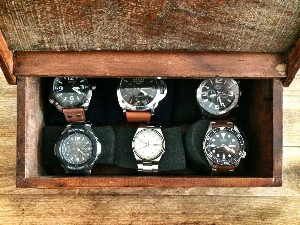Limpieza total, una ligera lijada en algunas zonas un poco dañadas y relojes adentro! Caben 6 perfectamente, aunque forraré el interior para evitar molestas rascadas de los armis con el fondo y compraré 6 almohadillas iguales para que no desentonen 😀 ahora he puesto las que tenía tiradas por casa... En conjunto creo que queda genial y es un bonito detalle que irá en mi escritorio, donde habitualmente trabajo.
