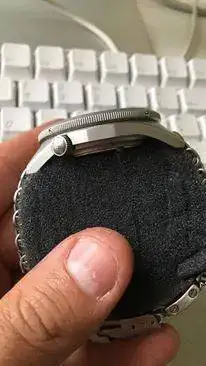 El cristal es un plexi con lupa para el dial y la típica goma para impedir el paso del agua. Encima del mismo tiene un aro metálico que va a rosca y encima de este tiene un bisel antes chapado en oro, el cual lleve a chapar en oro rosa antes de darme cuenta de que la maquina y la esfera no coinciden con la cavidad de la caja. La caja se manipula desde arriba, no tiene tapa trasera.