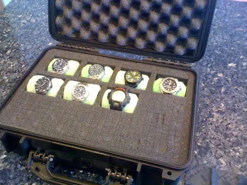 Hace tiempo mire las cajas pelican para guardar mis relojes, aunque otros modelos mas pequeños. Al final no lo compré pero miré mucho en tema de medidas y demás.