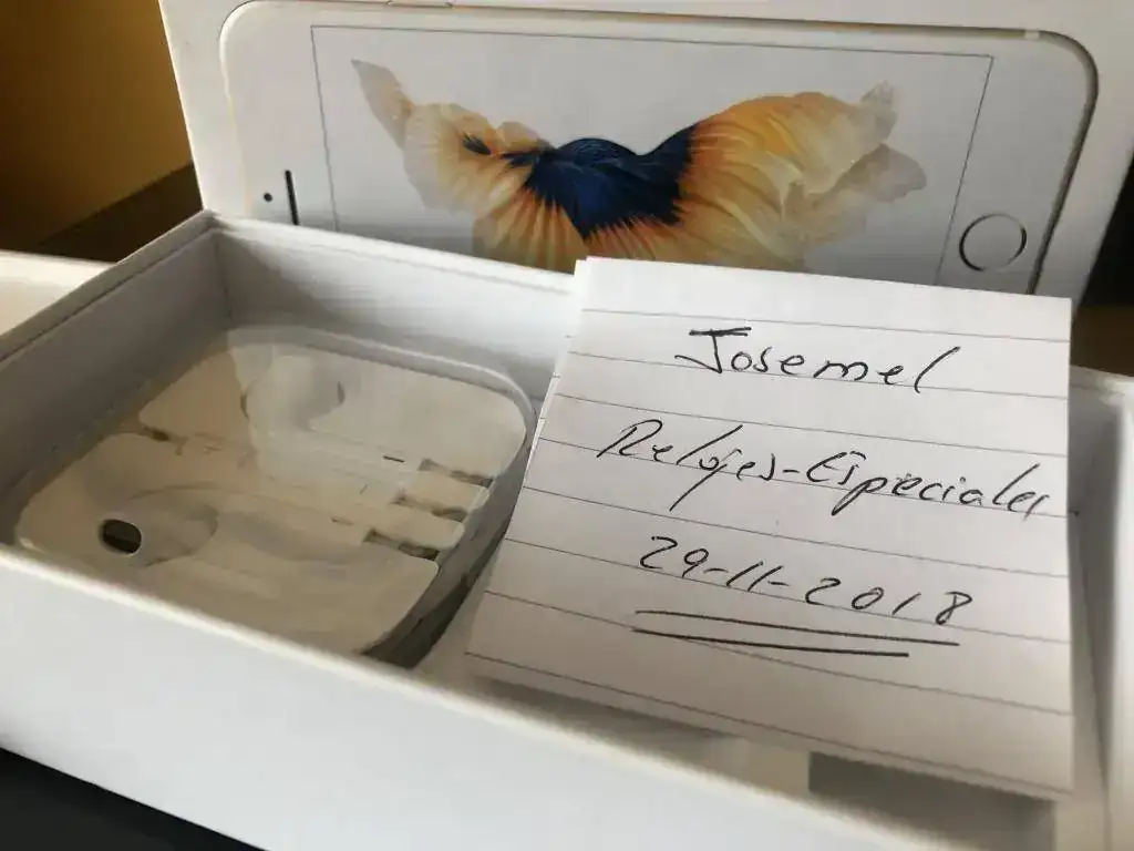 Vendo esta caja completa de iPhone 6s gold (menos las dos pegatinas) con sus auriculares Apple sin estrenar. El precio es de 30 euros.