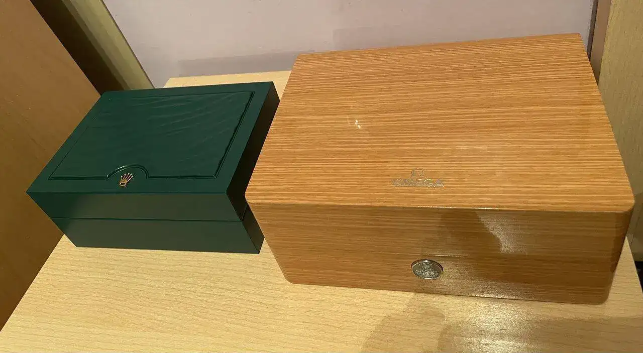 Hombre, las cosas como son: en Omega tras aquellas que se autodestruían pelándose ellas solas con los años (cosa que nunca se ha visto en las de Rolex a ese nivel) y tras haber aumentado un 300% el precio de sus relojes más icónicos, es lo mínimo que pueden ofrecer, no? una bonita caja de chapela lacada (ya que dudo muy mucho que sea madera maciza, como si eran las de Caoba de Rolex) sobre núcleo de DM, aglomerado o algún laminado barato. Y el tarjetero, ejem, espérate unos añitos a ver si se autodestruye como los de antaño o no. Un saludo.La más bonita ésta: