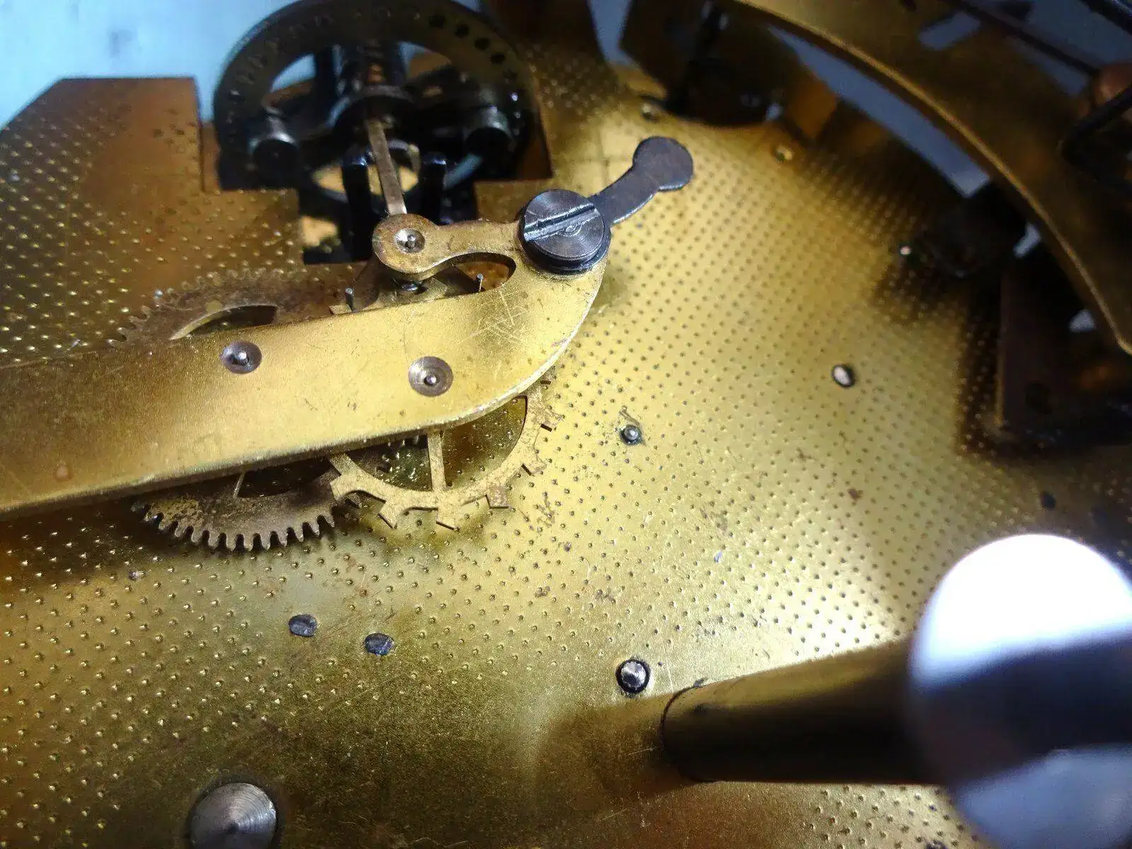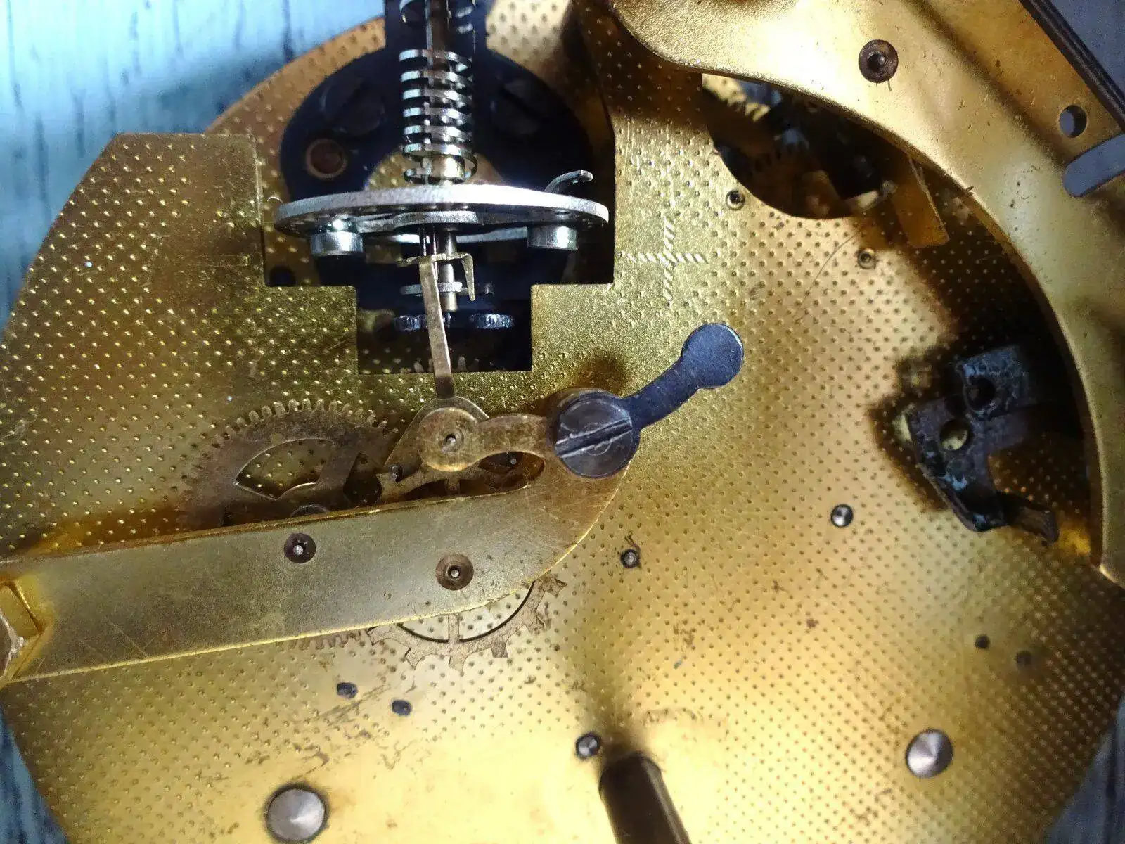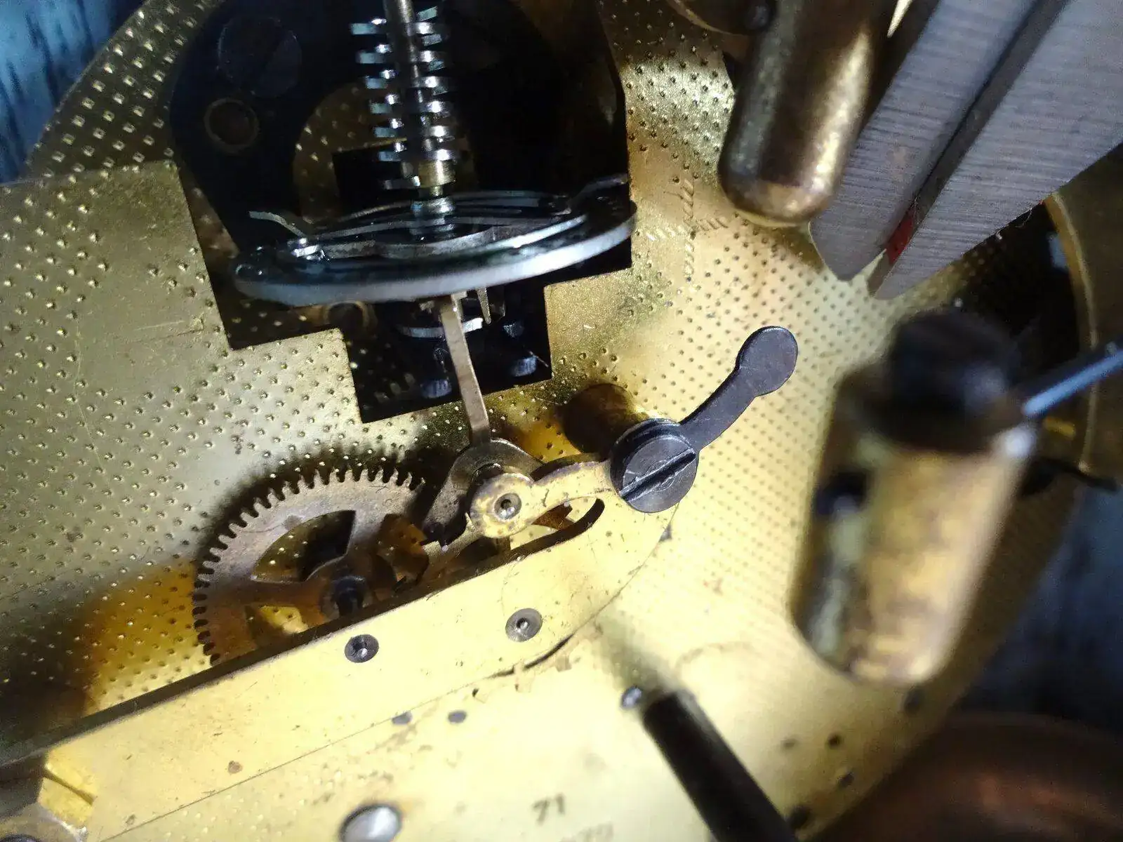 Corrección de problemas de equilibrio después de la inspección y las pruebas: el alambre doblado se endereza doblando la dirección opuesta usando presión en el tubo. Alambre áspero o roto: reemplace el alambre de la siguiente manera o reemplace el ensamblaje de la balanza. Apriete las pestañas superior e inferior lo suficientemente lejos del marco para permitir la extracción del cable. Los alicates diagonales o los cortadores al ras son buenos para esta tarea. Retire el cable viejo Determine el tamaño adecuado del cable (generalmente 25 mm). Use alambre de acero de resorte en el tamaño más grande disponible que no exceda el diámetro del alambre viejo Corte 6 en pieza. Si no puede obtener la sección recta. coloque 10 piezas en la prensa y tire de un arte con unos alicates. Esto dejará un pedazo más corto de alambre muy recto. Pase el alambre a través del marco superior y a través del tubo. Haga una curva de 90 grados en el cable en la parte inferior del marco Sujete el cable a la lengüeta inferior con 2-3 vueltas y presione la lengüeta nuevamente dentro del soporte. Apriete los brazos superior e inferior del marco ligeramente y sujete el cable a la lengüeta superior. No deforme permanentemente el marco. Libere la presión para permitir que el cable se enseñe más. Presione la pestaña superior nuevamente dentro del marco. Cortar el exceso de alambre. El tubo no está centrado entre la parte superior e inferior de la corrección del marco de la siguiente manera: mueva el collar inferior del tubo para alinearlo, o si la alineación es causada por una espiral doblada, corrija la distorsión de la espiral. El rodillo de seguridad no está alineado Ajuste mediante un ligero giro de los pasadores del rodillo. Acción lenta si no se corrige limpiando o enderezando el cable, reemplace el cable o el ensamblaje de equilibrio Joyas agrietadas - reemplace el ensamblaje de equilibrio Acción irregular de la espiral manipule / forme espiral para corregir el problema Marco doblado - doblar a la forma adecuada Fuera del ritmo rotar el collar superior (o inferior) para que los pasadores de los rodillos estén exactamente en el centro del conjunto de equilibrio cuando se ve desde la inspección y reparación de escape frontal: Verifique y ajuste la horquilla de la siguiente manera (esto establecerá las condiciones iniciales "ideales" pero puede necesitar un ajuste fino después del montaje completo): Cuello de la horquilla paralelo a Placas Ranura de la horquilla paralela al eje del palé Protector de seguridad paralelo al cuello de la horquilla Esquinas interiores de la ranura de la horquilla en un ángulo de 90 grados Tapas finales lisas y no vinculantes Arbol del palé Sacudida extrema en el arbol del palé Revise y ajuste los pasadores en el ancla de manera que estén paralelas al arbol del palé y perpendicular al ancla. Si se necesita un ajuste, intente doblar el latón en lugar de los pasadores para evitar que se rompan. Reinstalación del ensamblaje de la balanza: reinstale en el reloj, sosteniendo el ensamblaje en ángulo a medida que lo baja entre las placas. Apriete los tornillos lo suficiente como para eliminar la holgura. No apretar completamente.