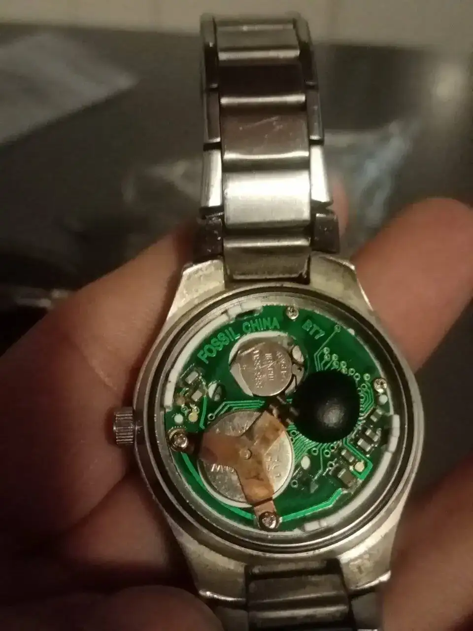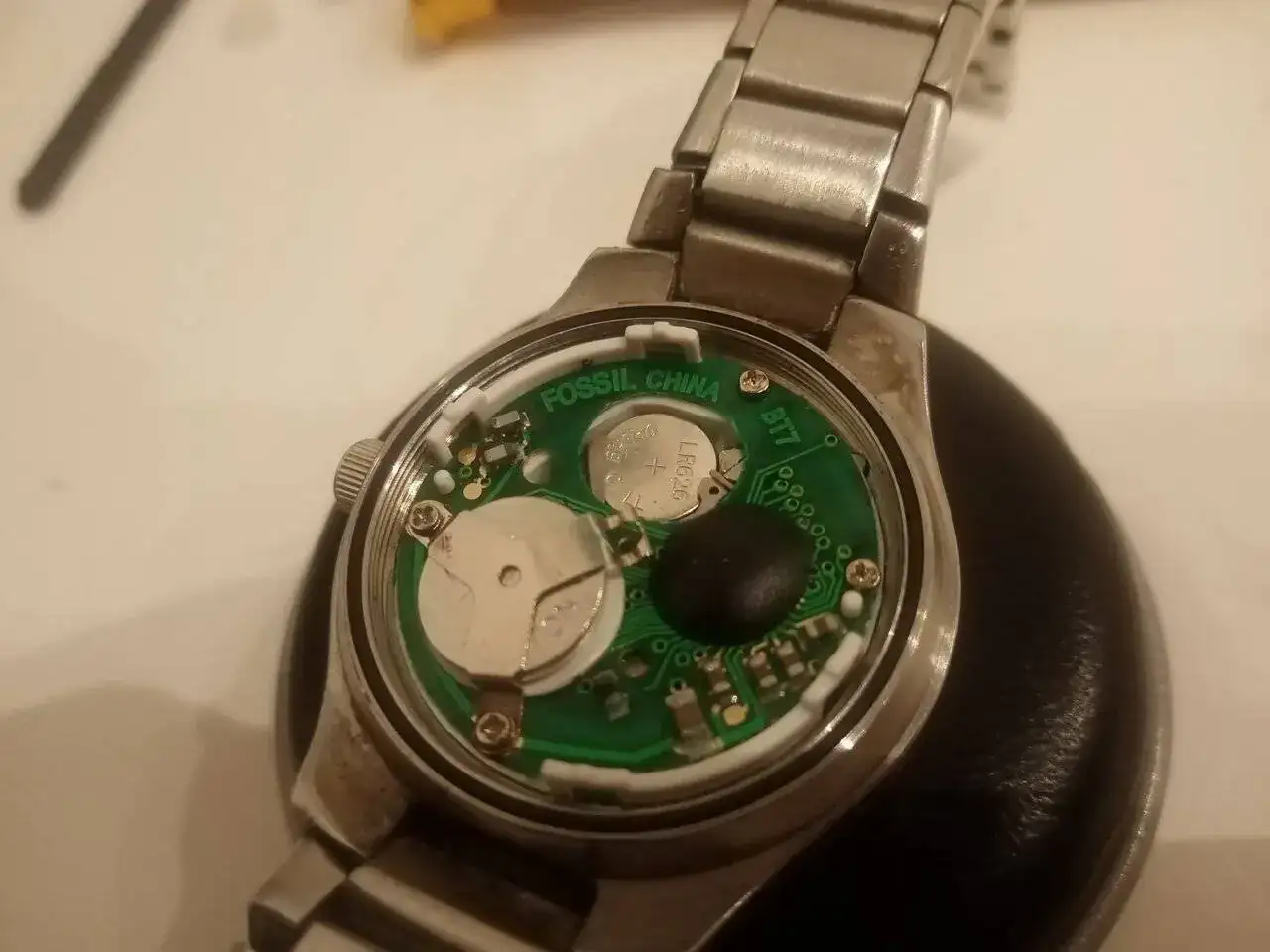 La cuestión es que al cambiarle las pilas, las agujas empezaron a andar sin problema alguno, pero no logro que se active el dial; cómo veréis en la fotos, el lugar de la pila para el dial digital, estaba muy sucio. Él me asegura no se había mojado, pero sospecho fue algo que liberó la pila, pues además del color de óxido, bajo la pila, el color negro tenía una textura viscosa "plasticosa" que se fue al limpiar con un bastoncillo (no sé si lo negro debería haber quedado, pero se fue). He estado mirando cómo resetearlo, pero tampoco he encontrado fácil los puntos que debo tocar con las pinzas para ello (quizás sea solo eso, con suerte),
