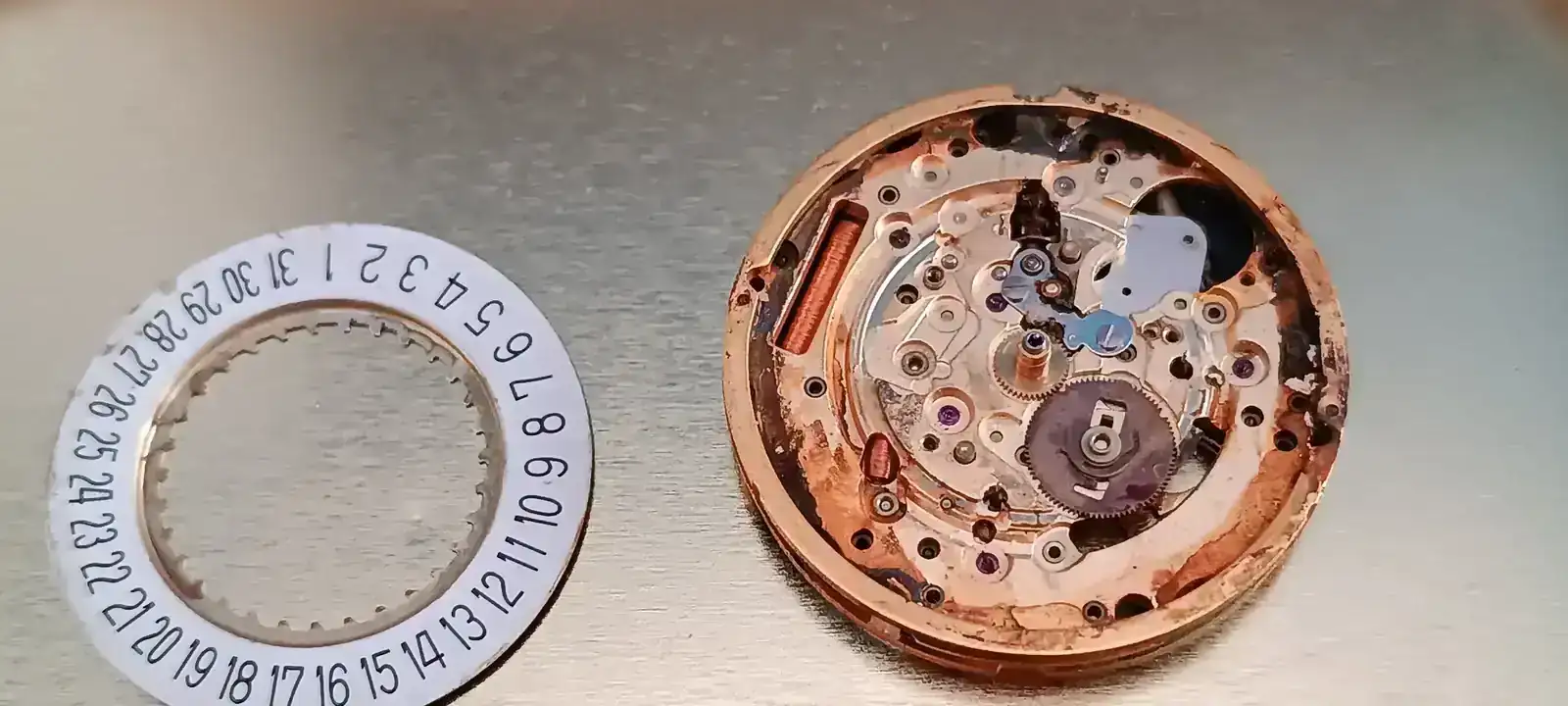 Al abrirlo en casa veo que el movimiento está completamente oxidado y desgraciado el pobre. Creo que se merece una segunda oportunidad así que me lio a restaurar el bicho.