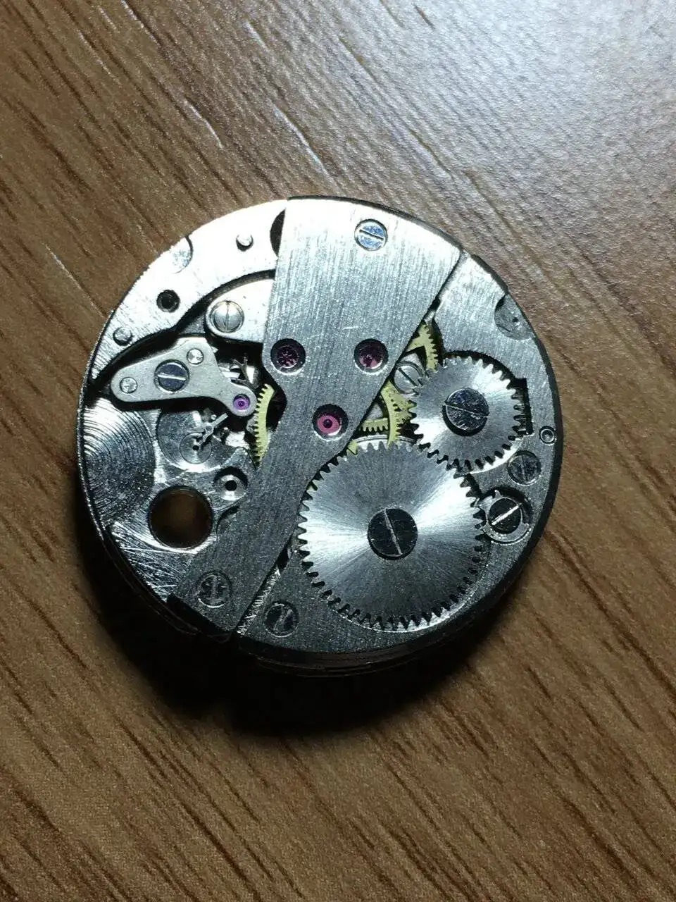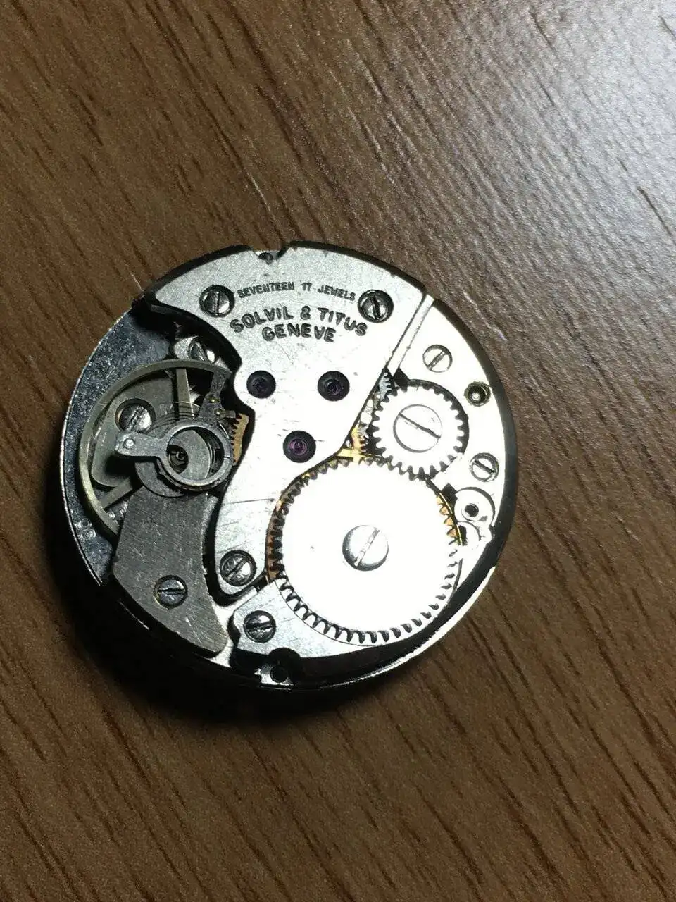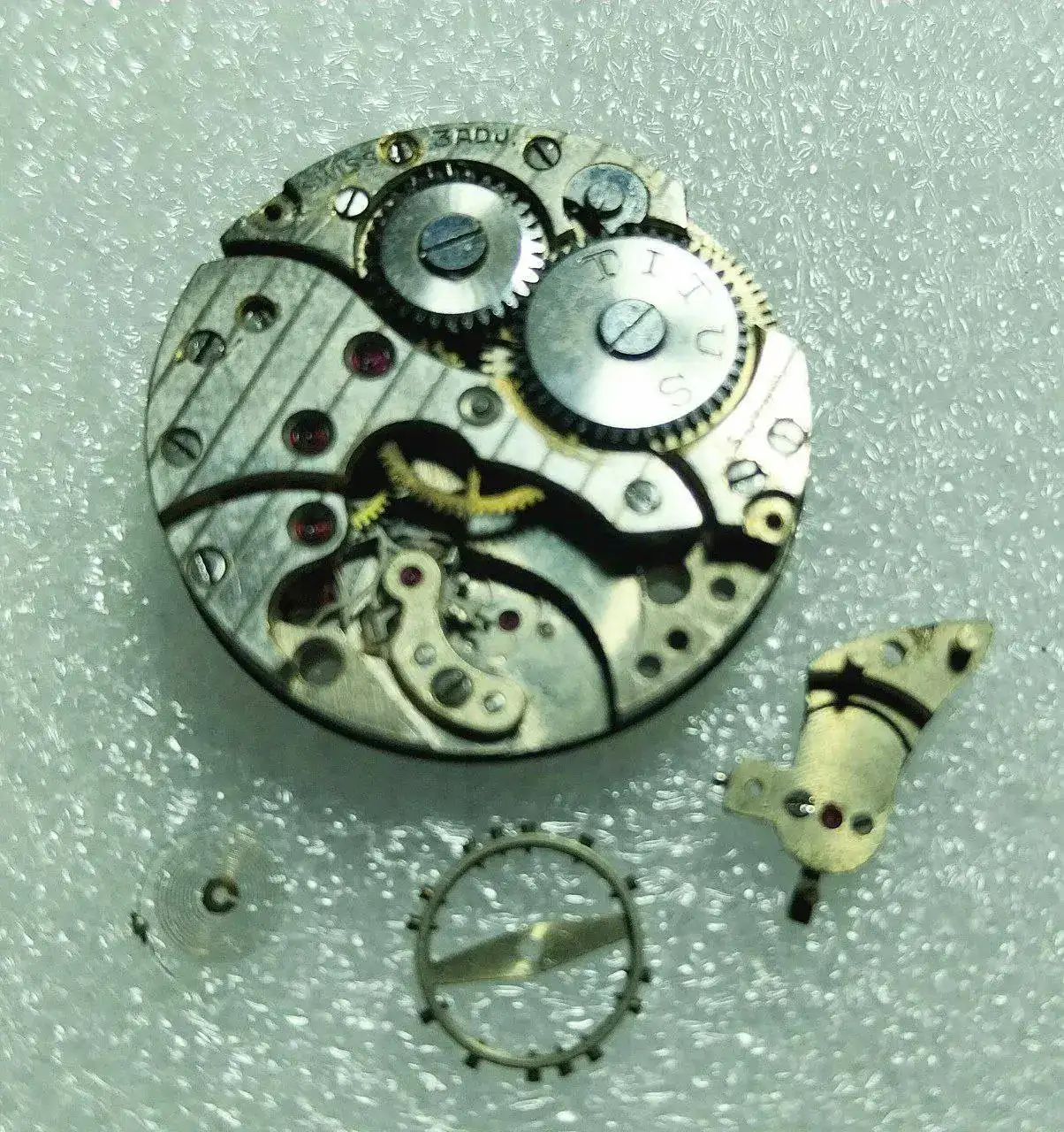Otro reloj de desguace. Esta vez un Titus que viene sin el eje de volante. Para valorar su viabilidad necesitaría saber qué movimiento es para buscar el volante completo. Pero he visto lo que aparece en la segunda foto, que creo que es una ñapa que le hicieron para sujetar las báscula. ¿Cómo lo véis?