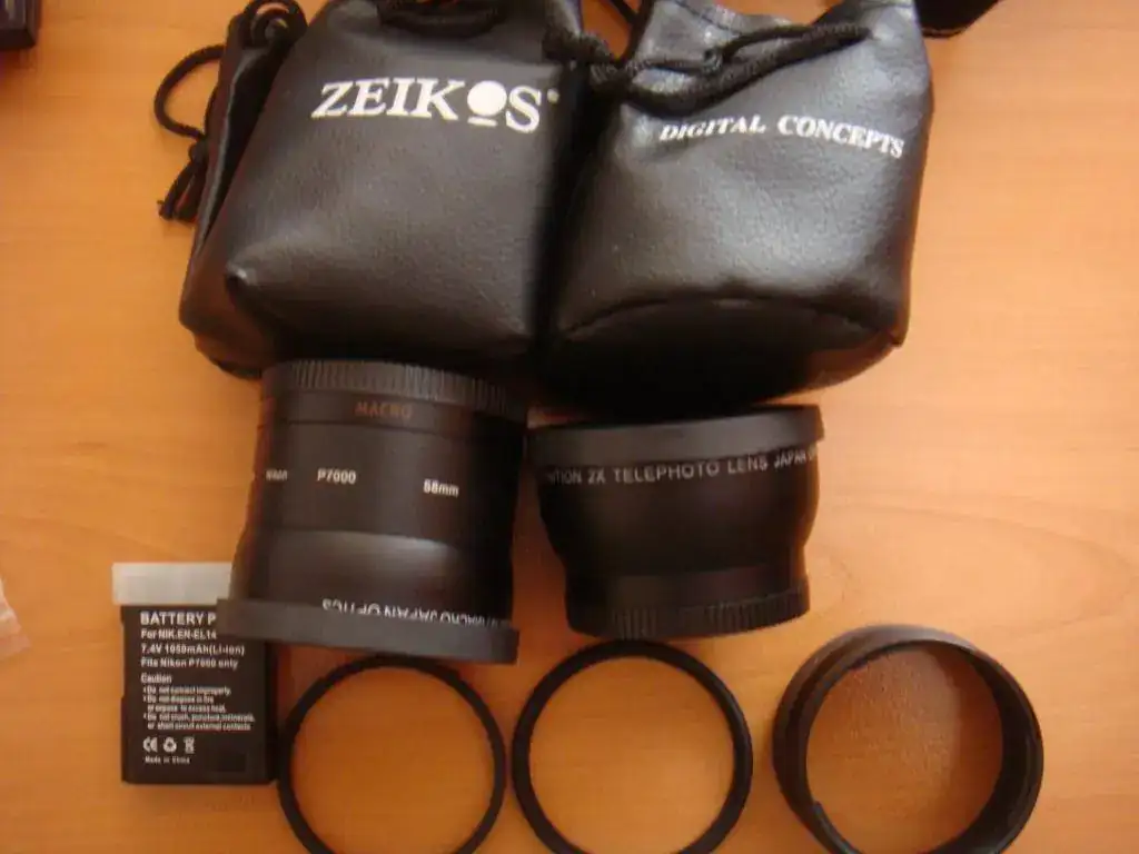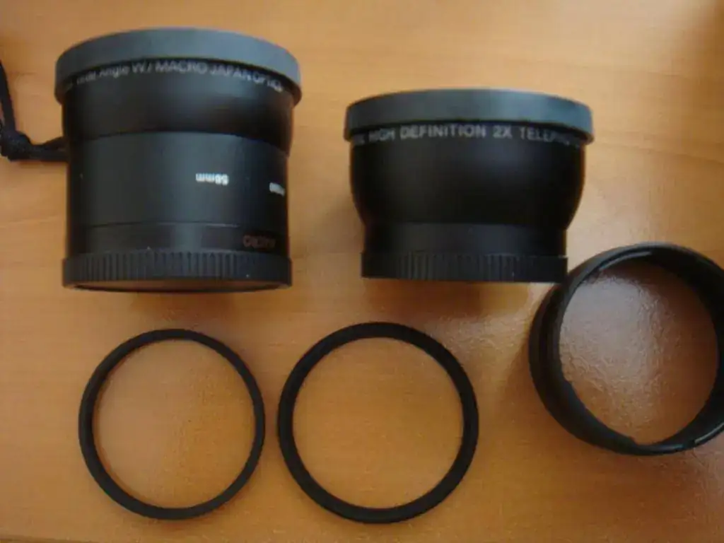 un anillo adaptador de objetivo y dos objetivos uno es un multiplicador optico X2, el otro un macro 0,45 wide angle/macro, una bateria de repuesto.