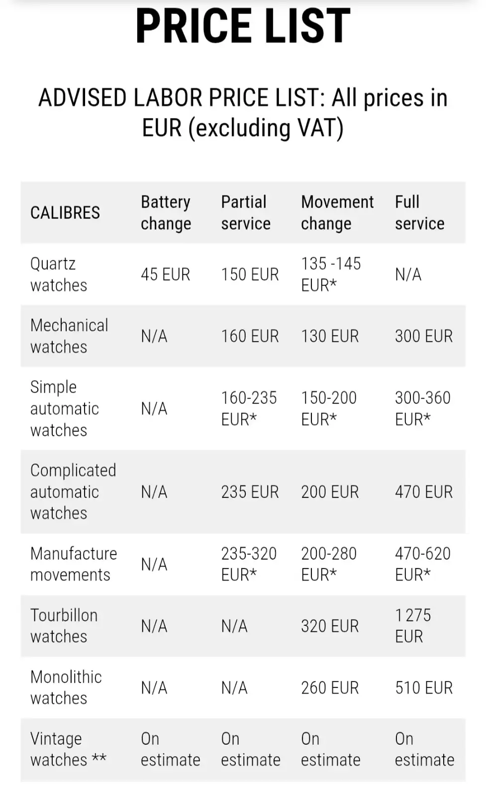 "COMPONENTS: The components requested for the repair will be charged additionnally ( Partial service/ and Movement change). only full service will include with the labor the change of the gaskets, crown, hands, bottom case screws"