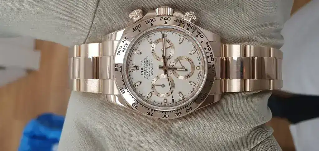 no se si es cosa mía, pero la caja se ve oro rosa en las primeras fotos y en la ultima, debe ser efecto óptico con el cambio de esfera y al verlo con armis, pero la veo mas Oystersteel....