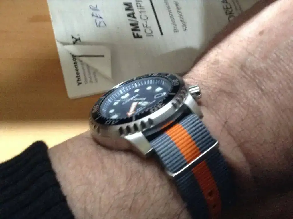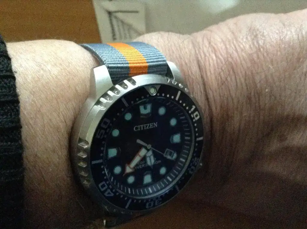 Bien, como antes del verano adquirí el Citizen Aqualand - BN0151-17L porque me gustó mucho su estética aunque no me dedico al buceo, pero si que iba y me bañaba con él puesto a la playa y a la piscina, la semana pasada encontré una correa Nato en la pequeña joyería relojería que tengo detrás de casa y como me gusta mucho este reloj, esto me permite poder llevarlo ahora sin la correa de caucho azul, con las tablitas de descompresión impresas, que cantaba como una almeja ahora en este tiempo, perdonad por la mala calidad de las fotos, aunque si que creo que se puede apreciar bien el resultado: