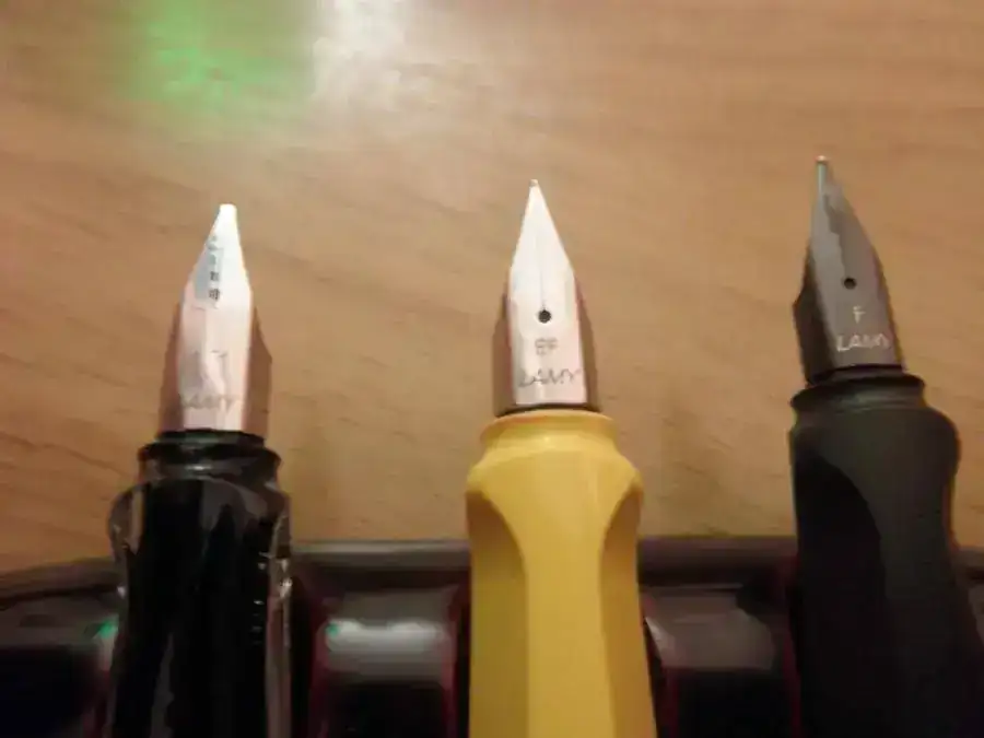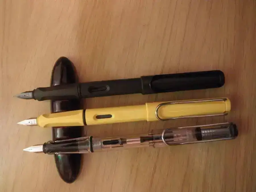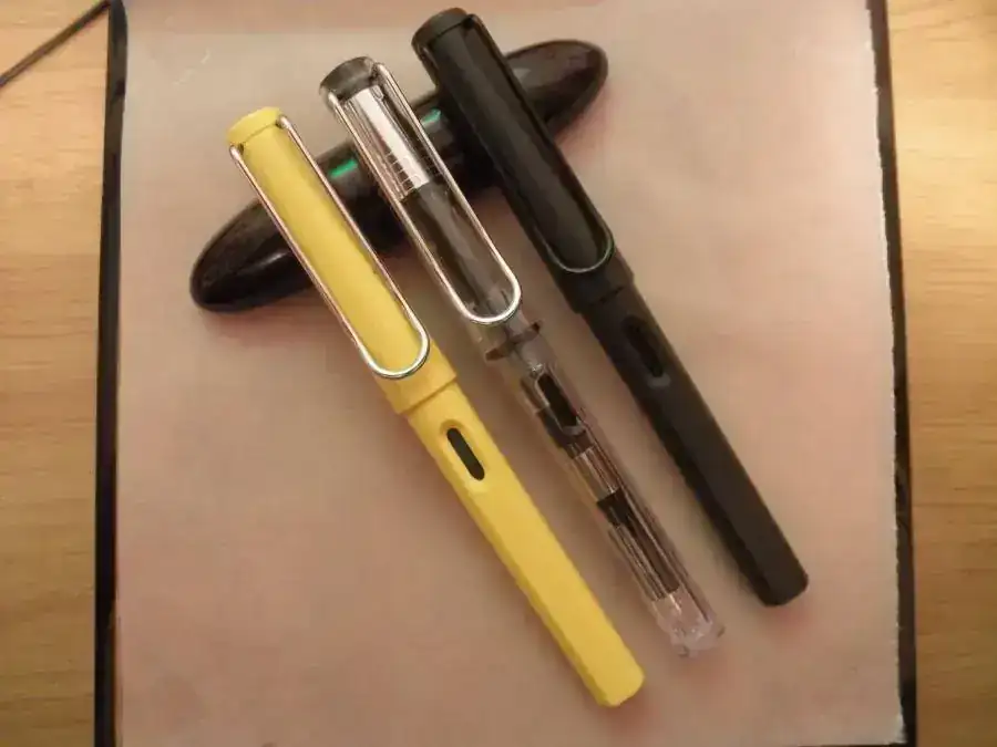 Y como venía Todos los Santos y no me apetecían lujos, y además había que ir al campo el fin de semana, me trasladé al otro extremo: tres Safaris. La Vista 1.1 con MB Irish Green (sí, repitió), la negra F con Iroshizuku Yama-Budo y la amarilla EF con Diamine Kensington Blue.