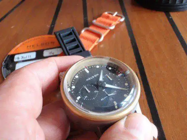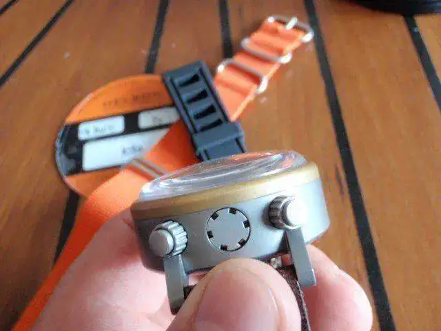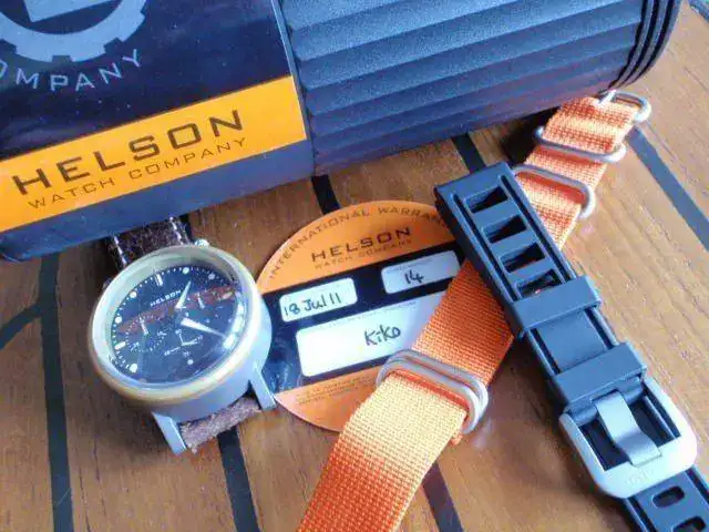 es un bicho de 47mm titanio monobloque (sin tapa trasera) con bisel de bronce , 4,5 mm safiro doble bombeado, valjoux 7750 ,fecha ,y 1000m ,corona escondida.los dos correas de caucho y nato naranja son nuevos el de cuerro en la foto ya no existe mas.el reloj tiene ligeras marcas de uso.