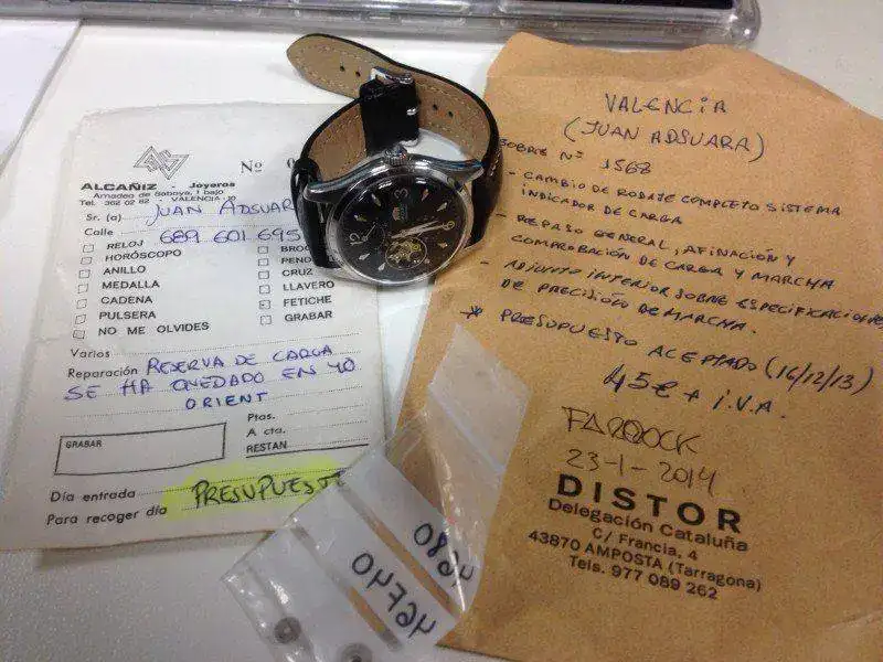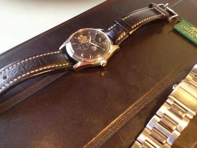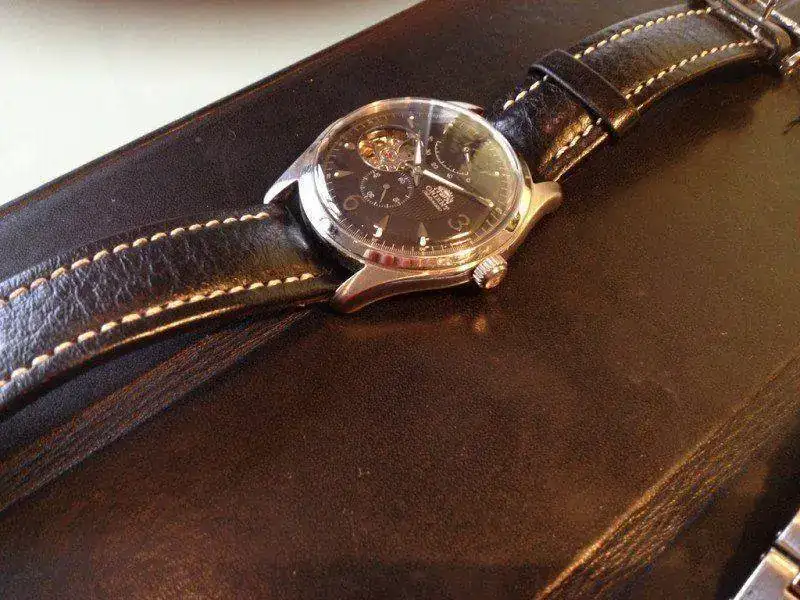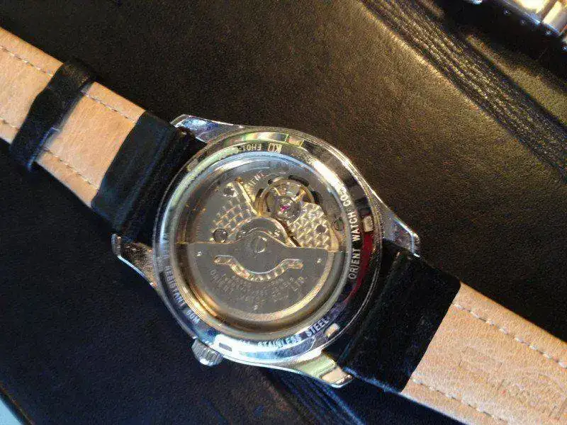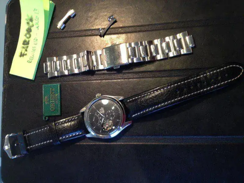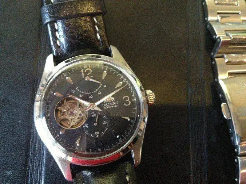 Es un reloj de vestir muy bonito de 40mm aprox sin corona. Esfera con textura, agujas y horas en luminova, corazón abierto y complicación de reserva de marcha. Corona firmada y fondo visto. 50m. En la parte frontal lleva un plexi. El reloj es muy elegante para mi gusto sin la indicación del día. El calibre es un FH 46S de 23 jewels automático de la propia Orient sin remonte manual. El segundero va en aguja pequeña aparte. Muy de vestir.