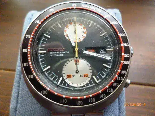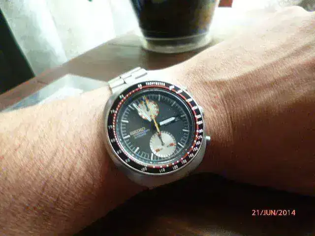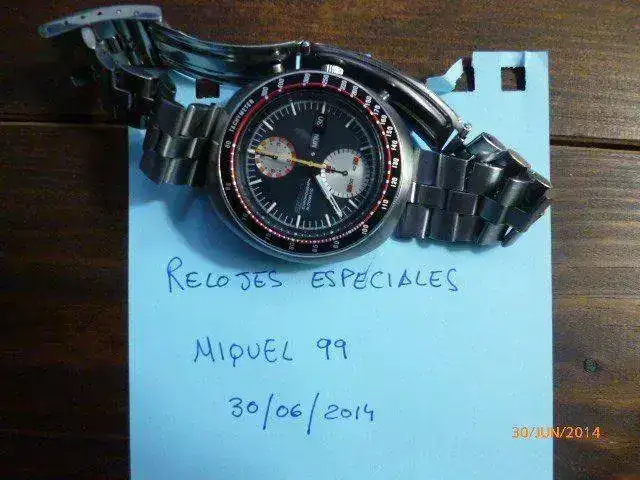 Esta unidad es de Enero de 1971, todo un vintage para coleccionistas, con una estética muy especial. No tengo ni caja ni papeles. Su calibre cronográfico, es una variante del 6139; Automático, carga manual, pase de fecha rápido, rueda de pilares,embrague vertical,21600... de lo mejor en calibres crono de la casa seiko. En su tiempo, estos cronos eran bastante elitistas y no al alcance de cualquiera. yo casi no lo uso y es una pena que esté en la caja. Yo lo valoro en 450E y me gustaría cambiarlo por un reloj de estética marine, con subsegundero a las 6, lease hamilton, stowa marine... pero me dejo tentar por otros relojes