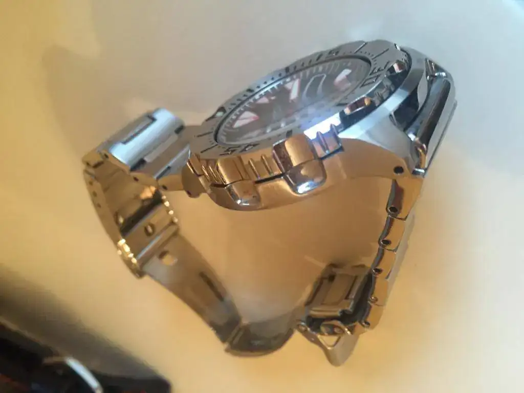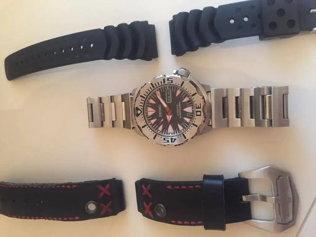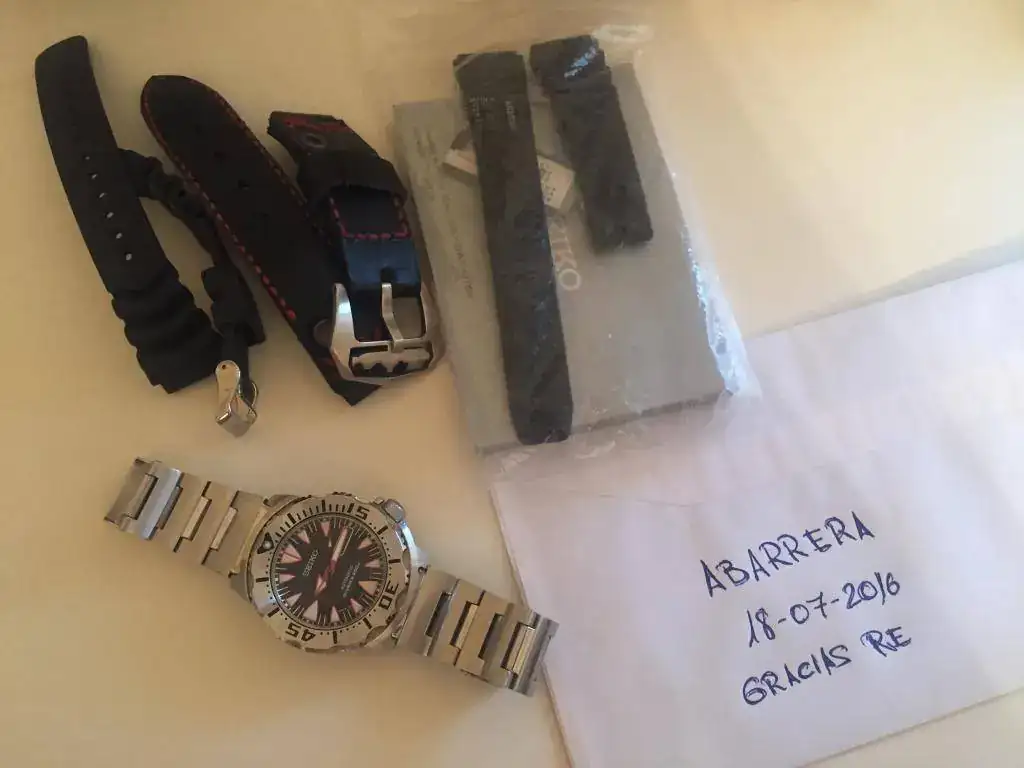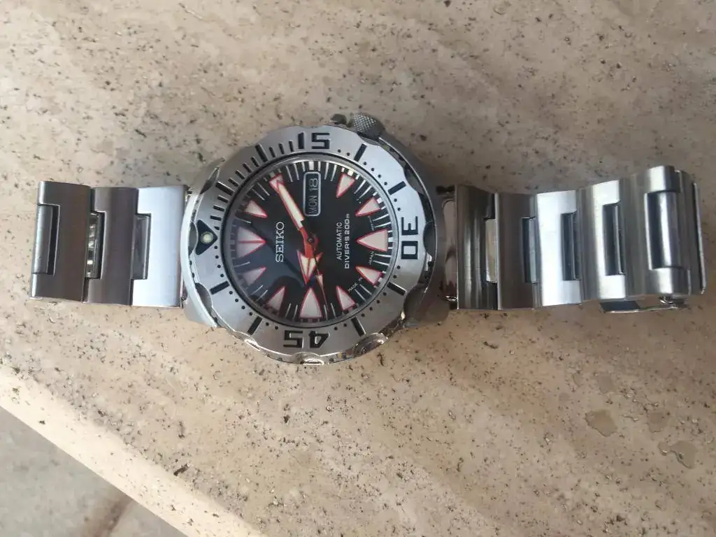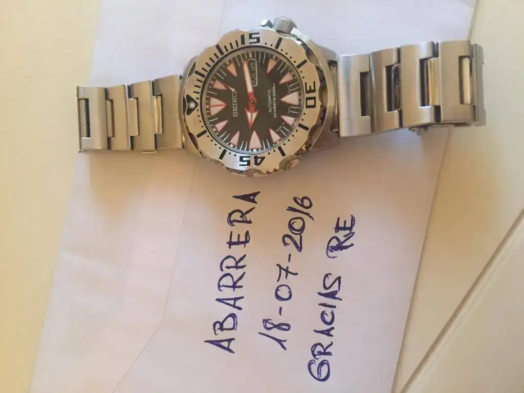 Propongo para cambio este precioso y contundente Seiko Monster Vampi en muy muy buen estado ( con los típicos pelillos ), lo compré con muchísima ilusión las pasadas navidades a un amigo forero y he intentado muchísimas veces llevarlo conmigo pero mi maltrecha muñeca de 15 cm. no aguanta este amigo durante mucho tiempo. El reloj tiene una precisión y un barrido de la segundera dignos de otra división, el lumen es asombroso y el estado muy bueno pero a mi pesar debe salir y dejar entrar alguna pieza más pequeña y acorde a mis características.