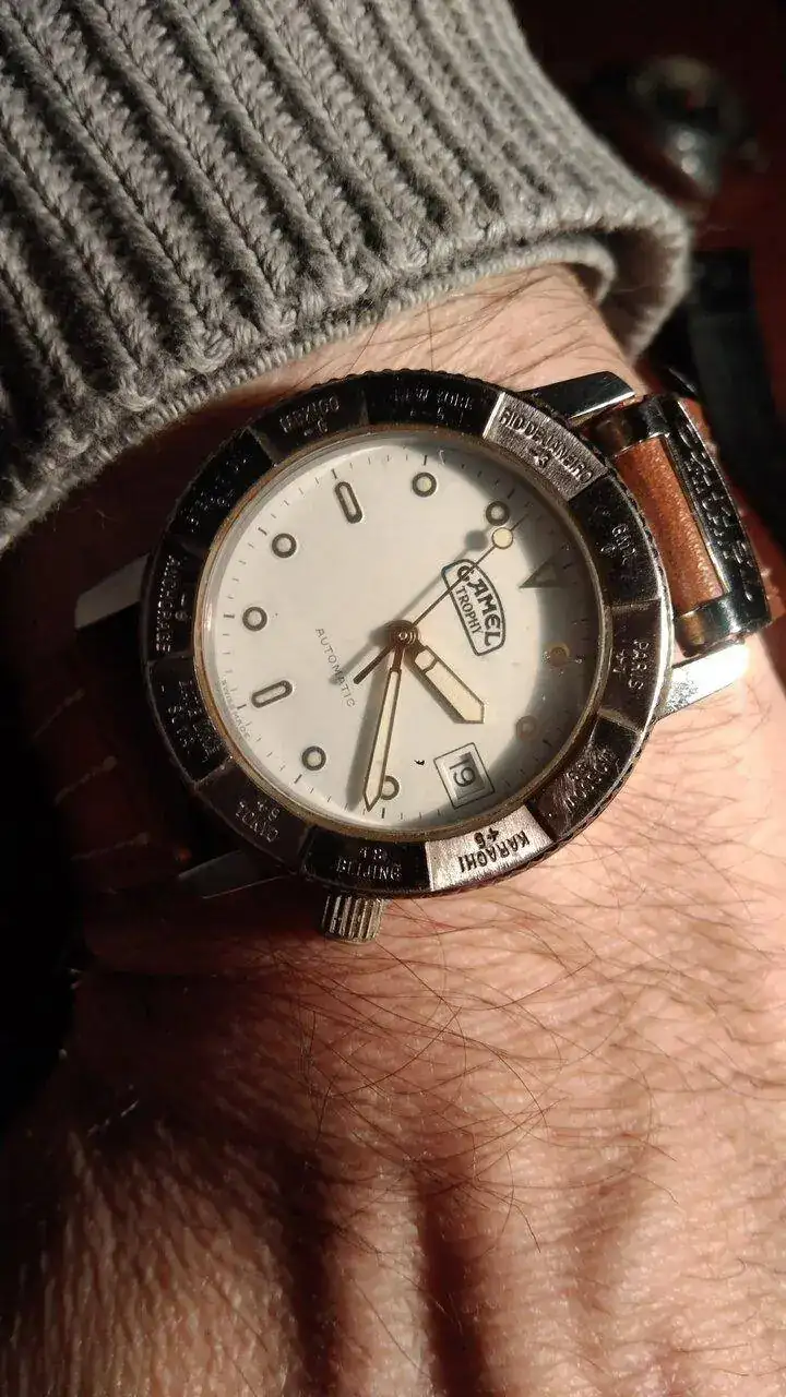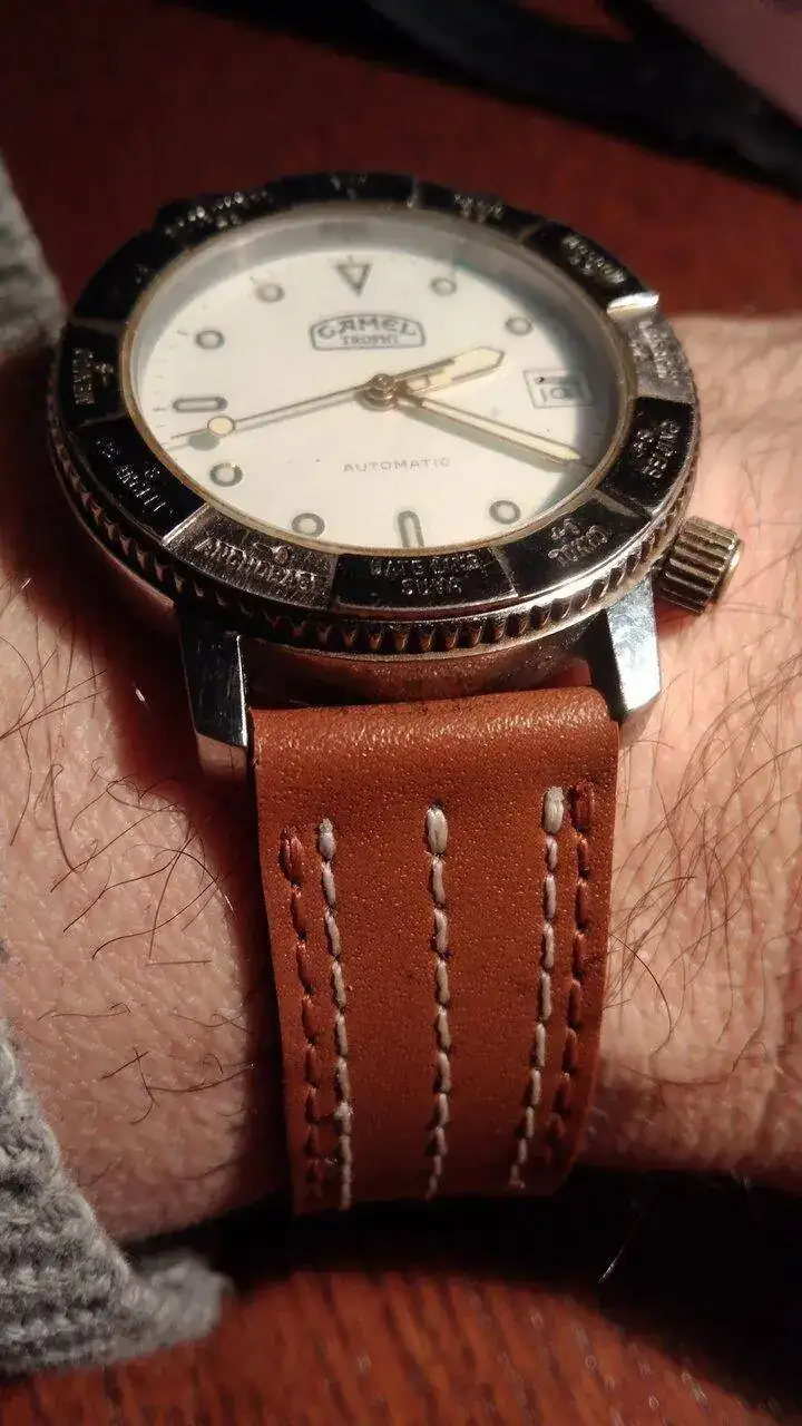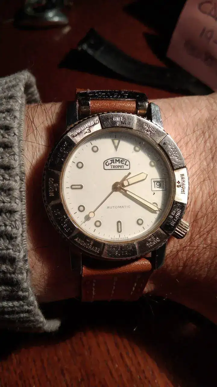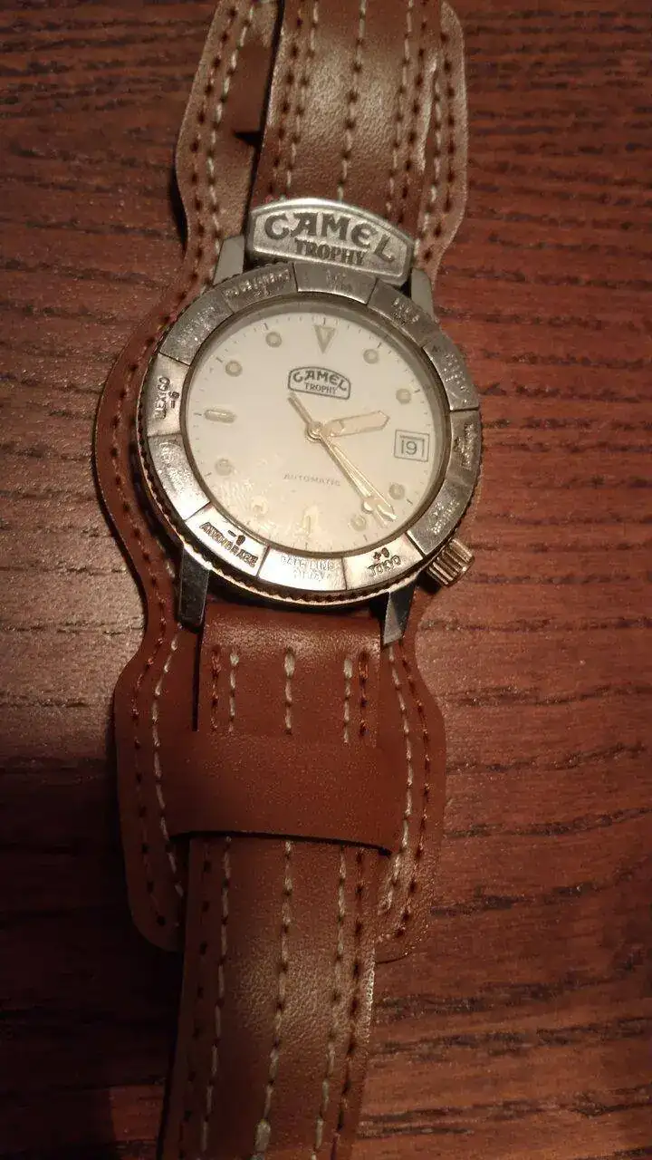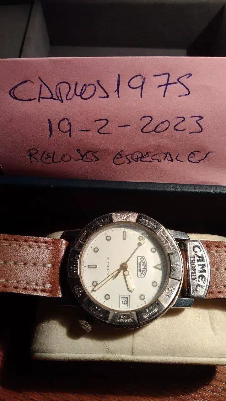 El esta ocasión saco a la venta un Camel trophy automático suizo, creo que el único que sacó la marca automático y suizo, es un Green belt del año 1990, todo de acero inoxidable, funcionando perfectamente, es un reloj magnífico, sin ninguna marca en caja cristal o esfera, está impoluto, se entrega con la correa nueva, un gran reloj con una gran historia