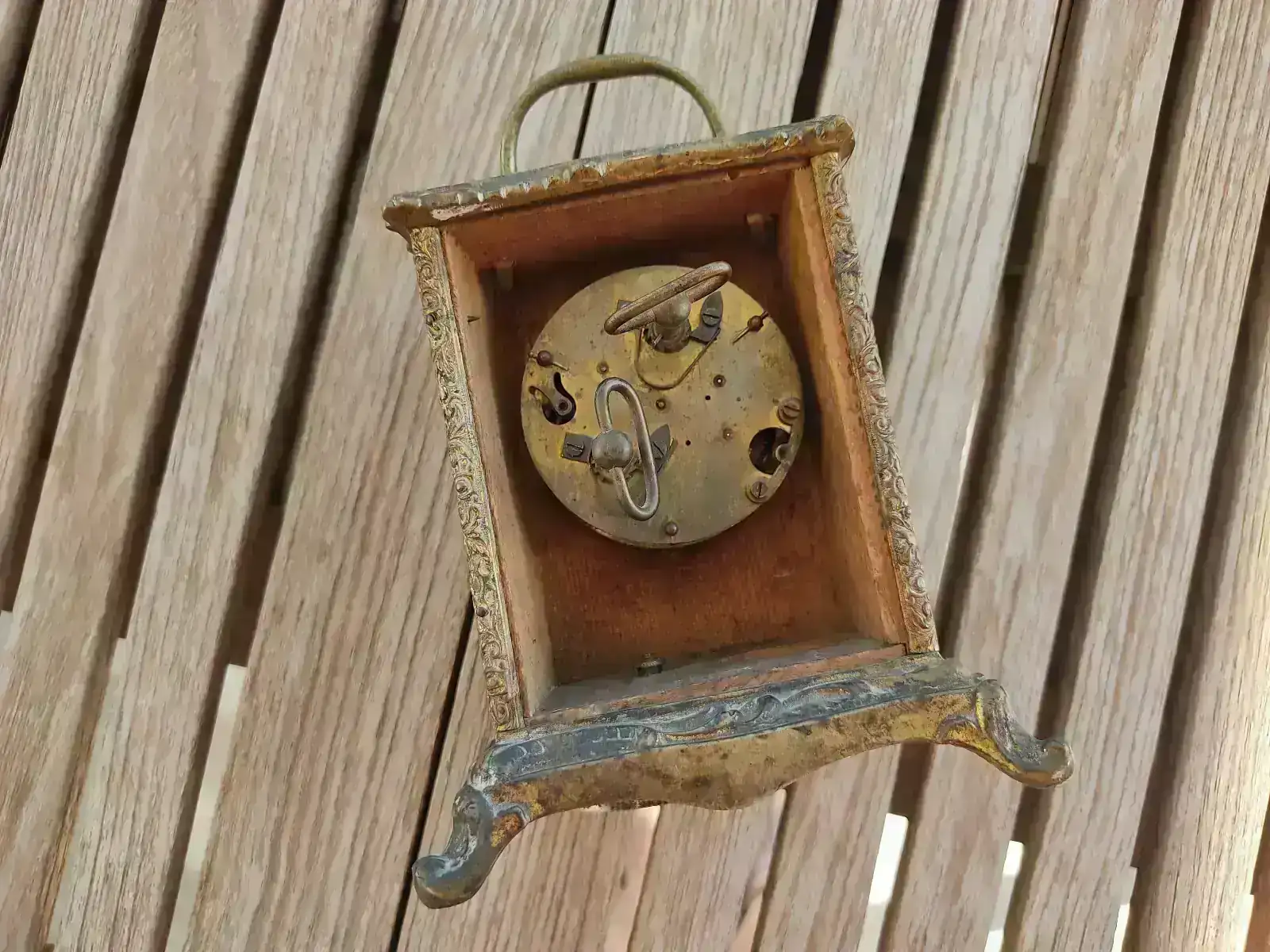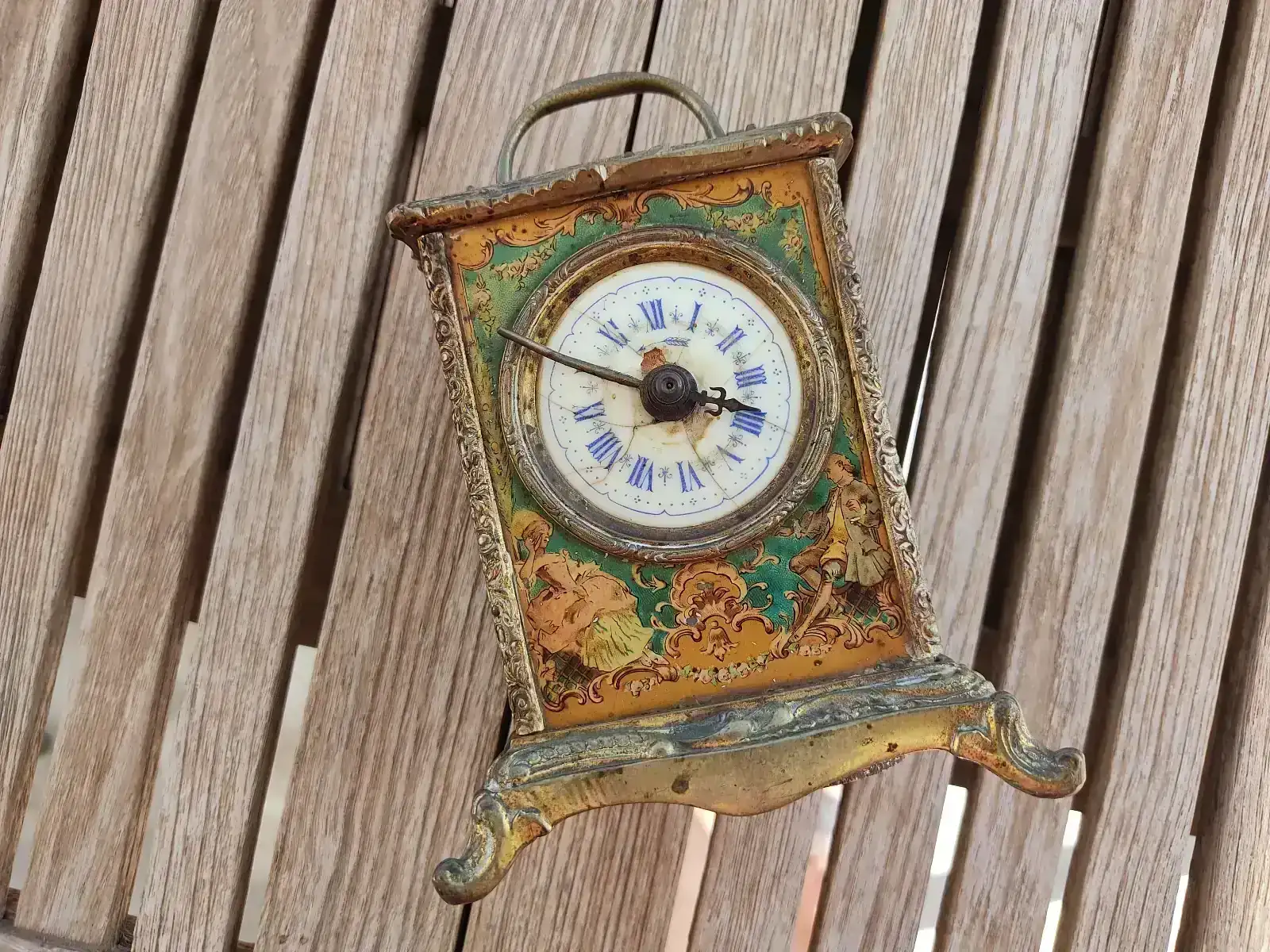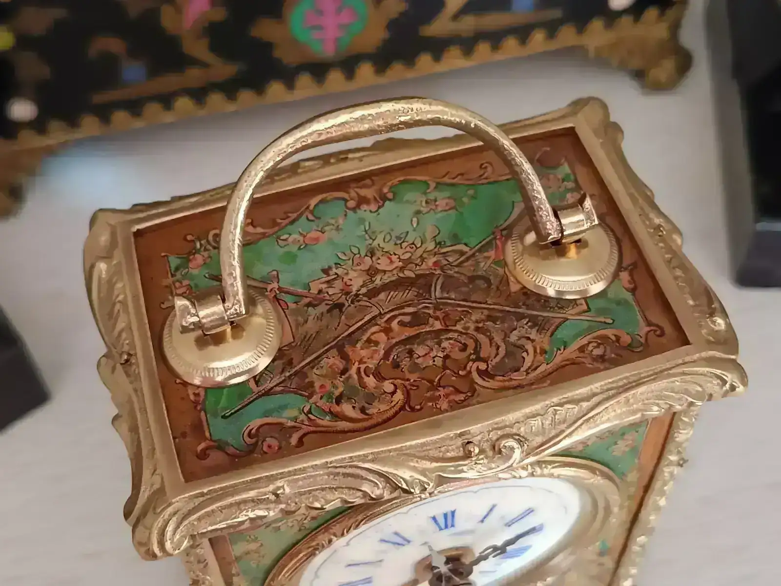 Seguimos en modo aprendizaje. Esta vez le ha tocado a un reloj de carruaje de finales del XIX con pendulina. Nada más verlo me llamó la atención por la decoración que presentaba, aunque pronto me di cuenta que iba a llevar mucho trabajo. Como puede verse en las fotografías, además de faltarle una aguja y la tapa trasera, la pintura estaba bastante deteriorada y los dorados muy sucios.