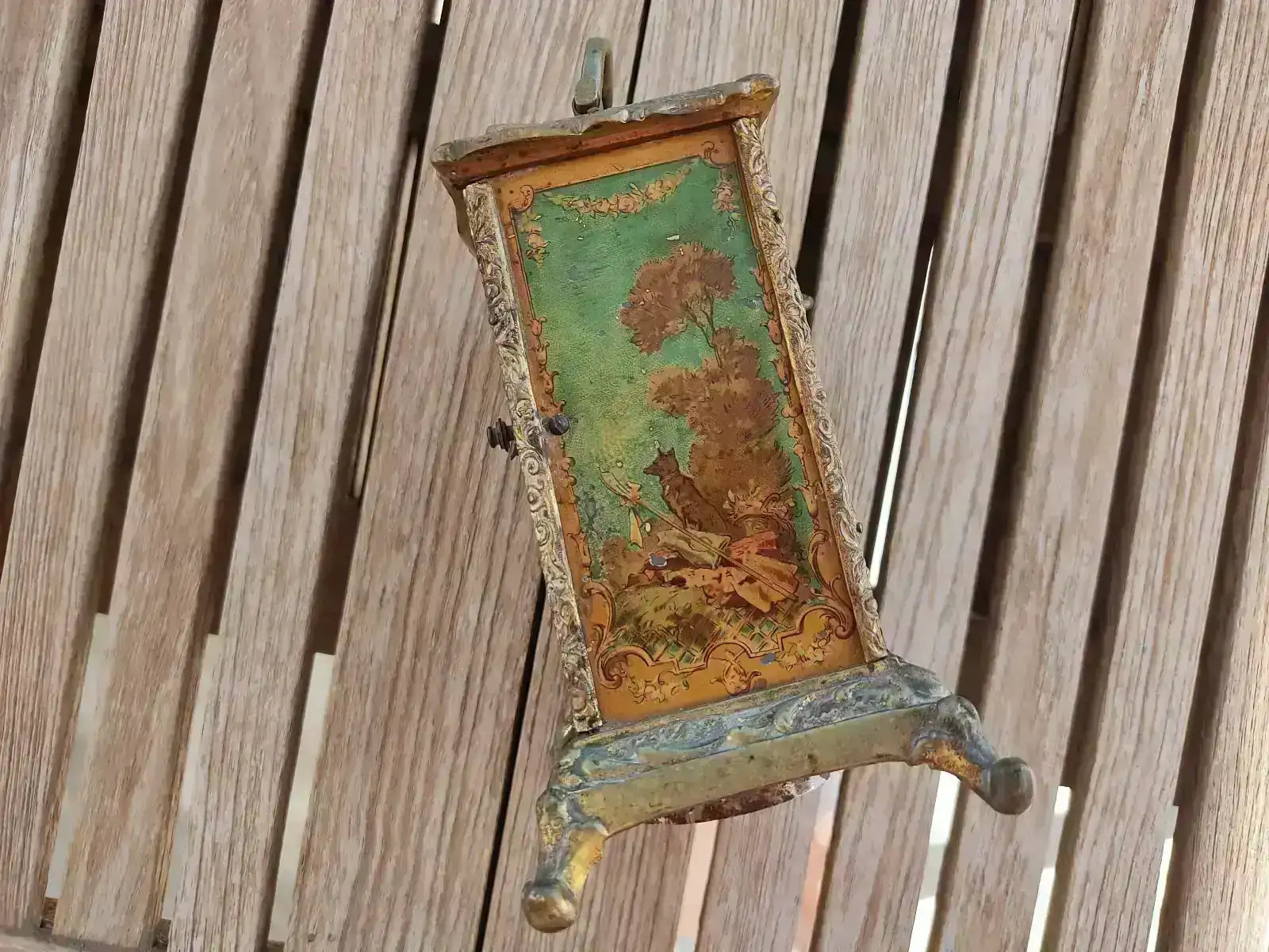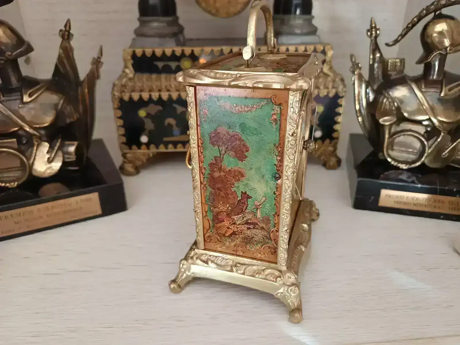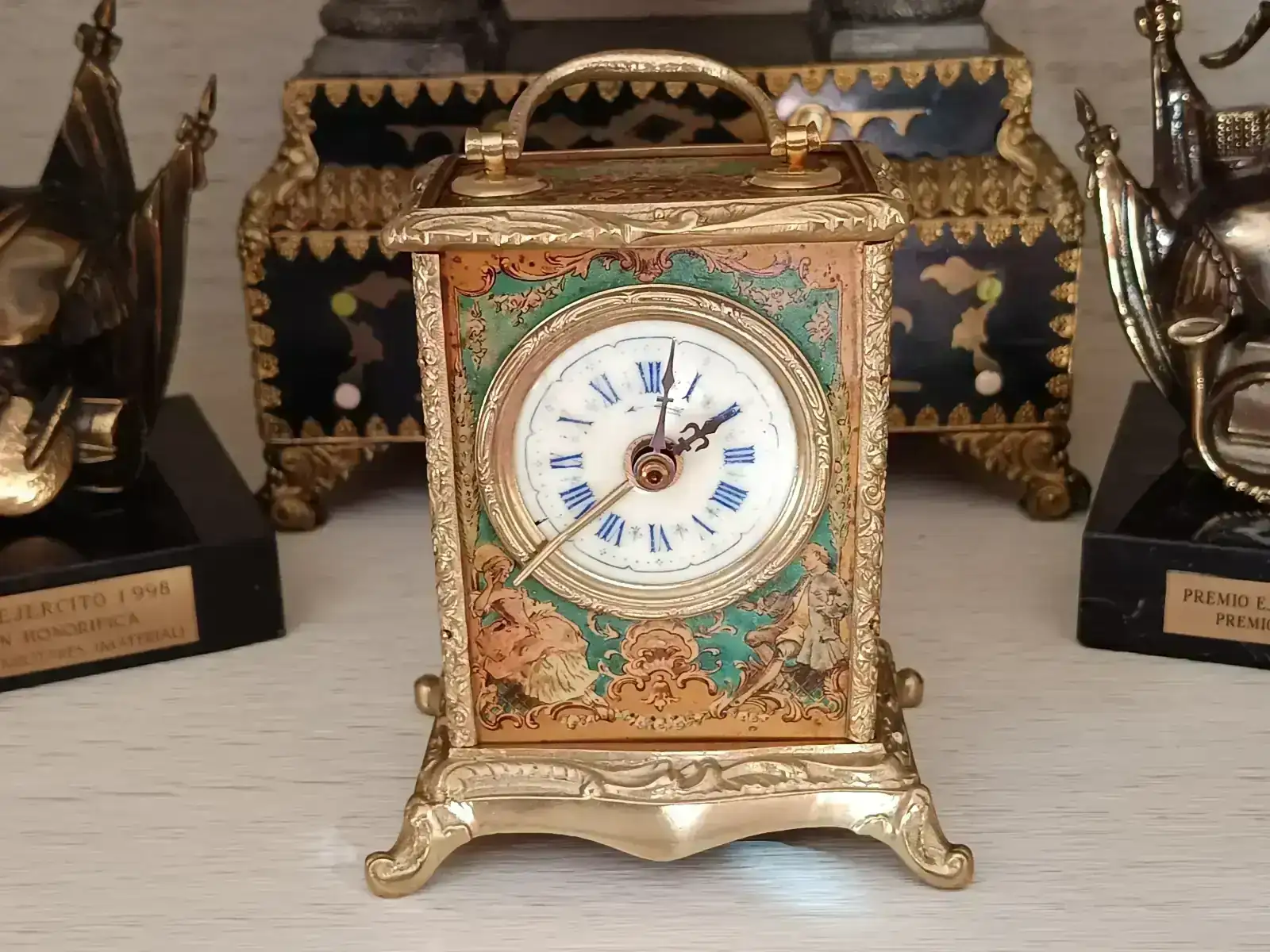 Seguimos en modo aprendizaje. Esta vez le ha tocado a un reloj de carruaje de finales del XIX con pendulina. Nada más verlo me llamó la atención por la decoración que presentaba, aunque pronto me di cuenta que iba a llevar mucho trabajo. Como puede verse en las fotografías, además de faltarle una aguja y la tapa trasera, la pintura estaba bastante deteriorada y los dorados muy sucios.