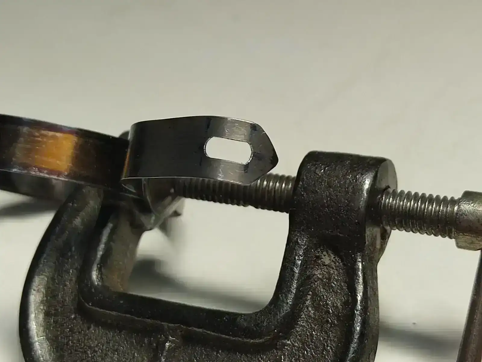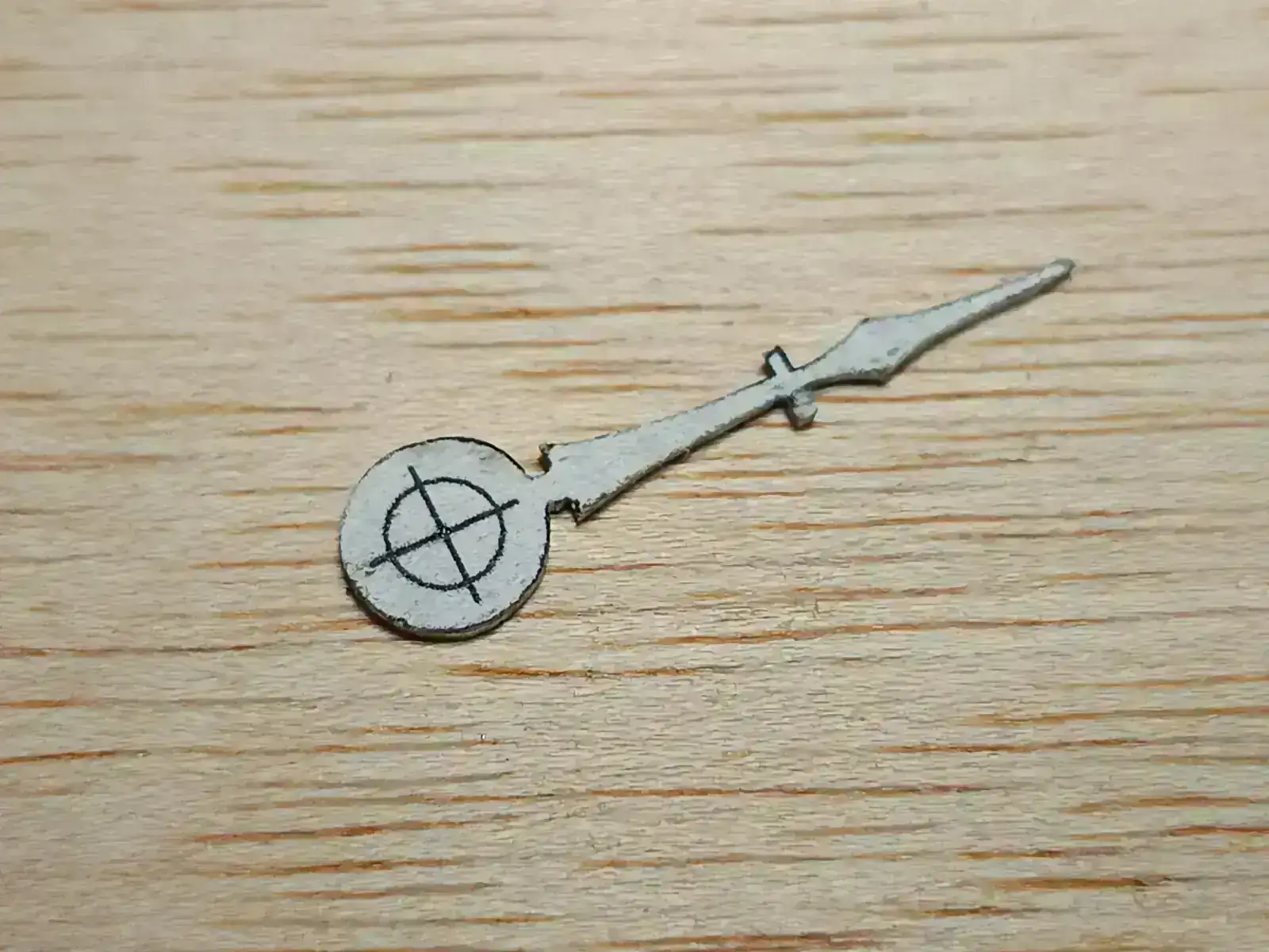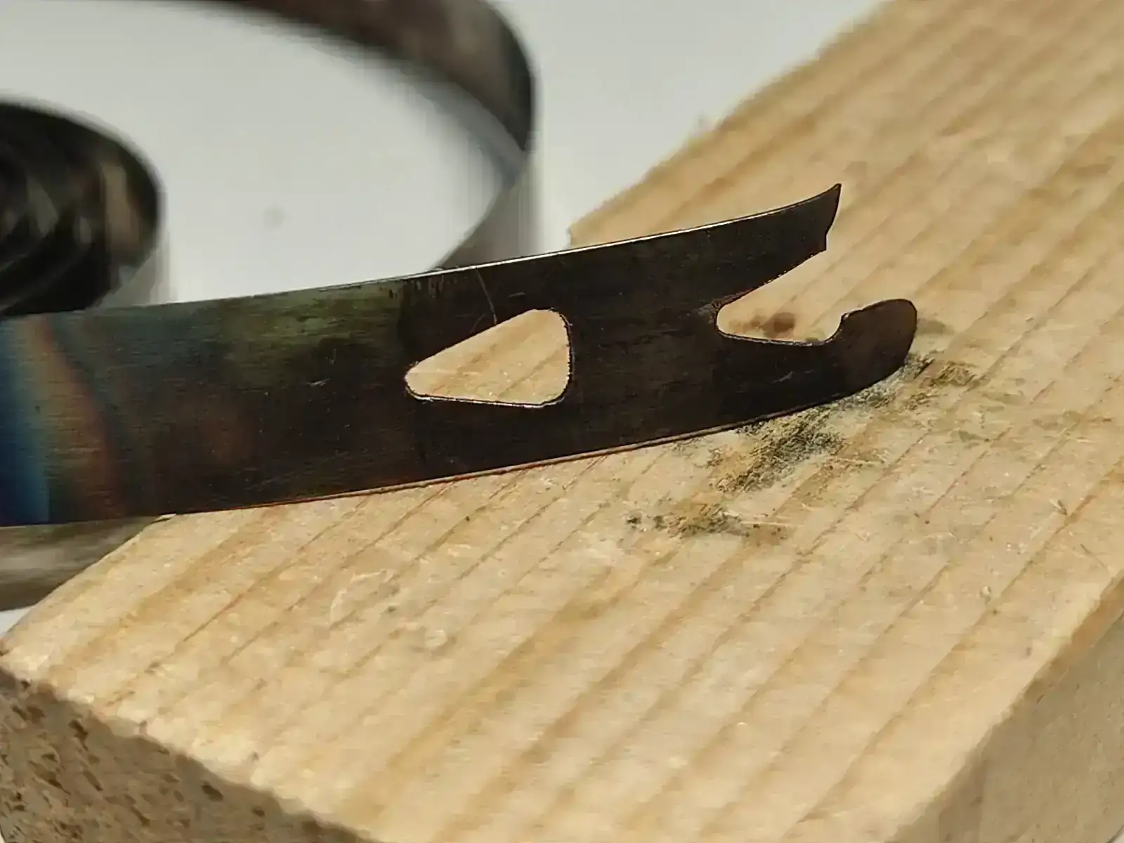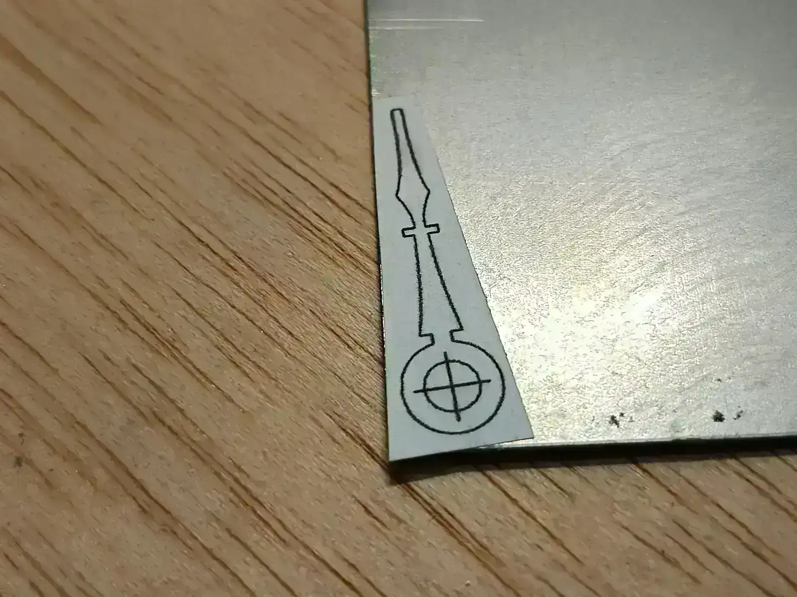 Lo siguiente fue realizar la aguja. Más o menos el proceso siempre es el mismo, dibujo en corel, se pega la plantilla con pegamento de barra sobre la plancha de metal, se corta a mano con una segueta de joyero y por ultimo se ajusta con lima.