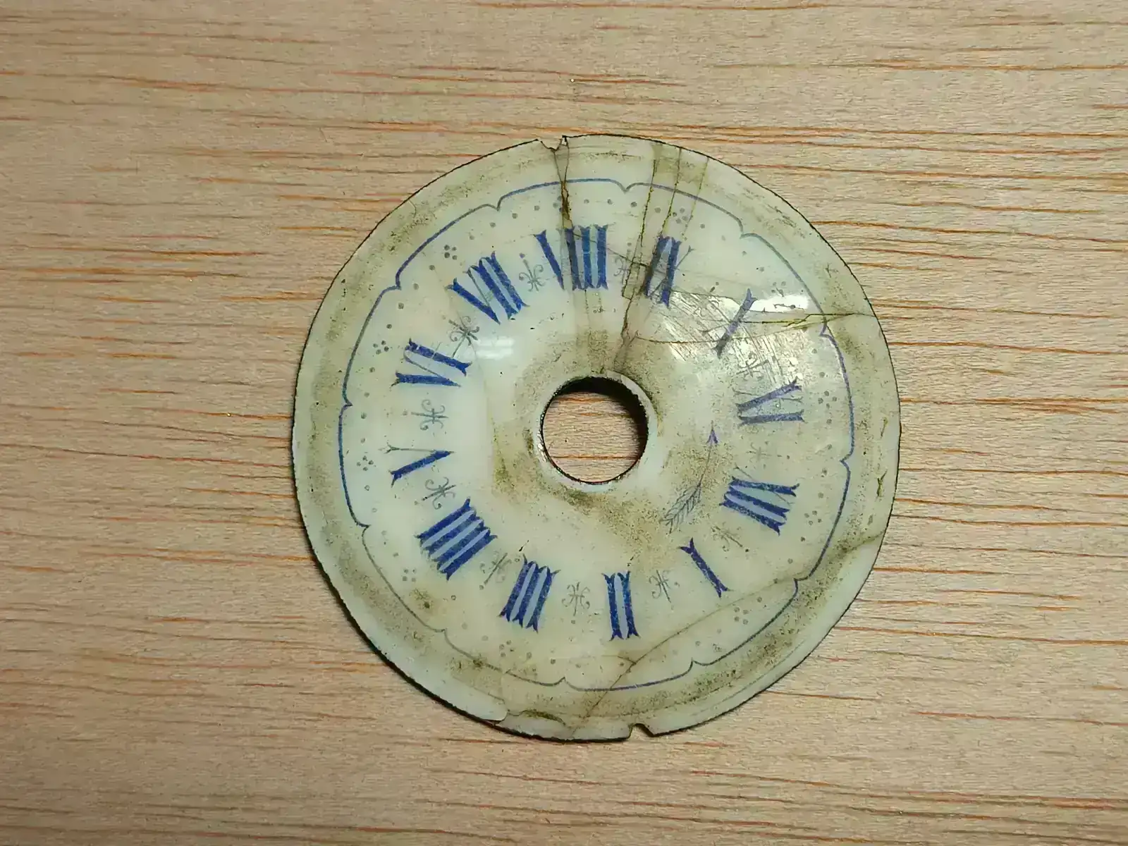 La esfera presentaba un estado lamentable con unos cuantos rotos que podrían ser un problema a la hora de colocar la aguja de la alarma. Después de limpiarla con agua, jabón y un cepillo de dientes, la he sumergido en amoniaco en la lavadora de ultrasonidos, a 75 grados de temperatura durante 5 minutos, y así hasta que no quedan restos de suciedad en las roturas.. Puede verse el antes y el después.