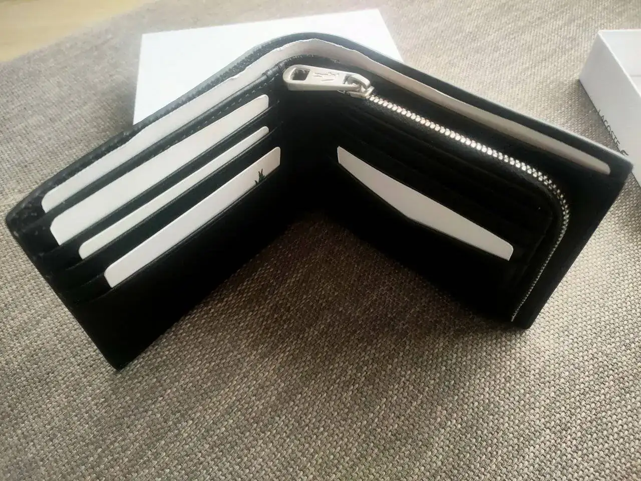 con un bolsillo para billetes, bolsillo para monedas con zipper, tres bolsillos interiores y