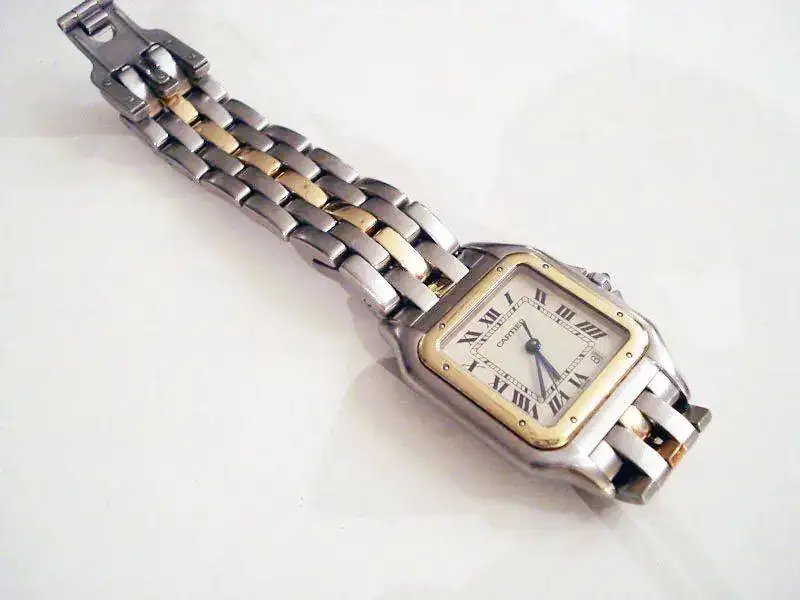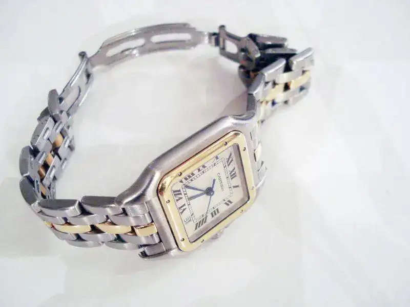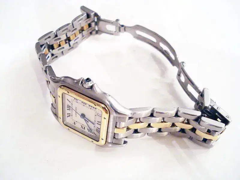 Observaciones : Cartier de mujer, modelo Phantere mixto acero y oro. Esfera blanca típica de Cartier con número romanos. Diámetro de 27 mm, movimiento de cuarzo, cristal de zafiro, caja de acero y bisel de oro atornillado a la caja, agujas azuladas, corona decorada con espinela, armis de acero con una bandas en oro.