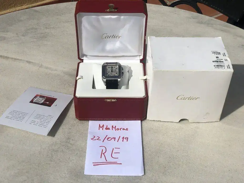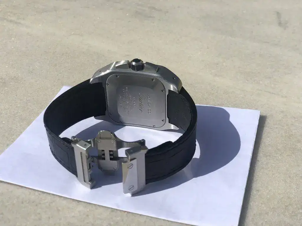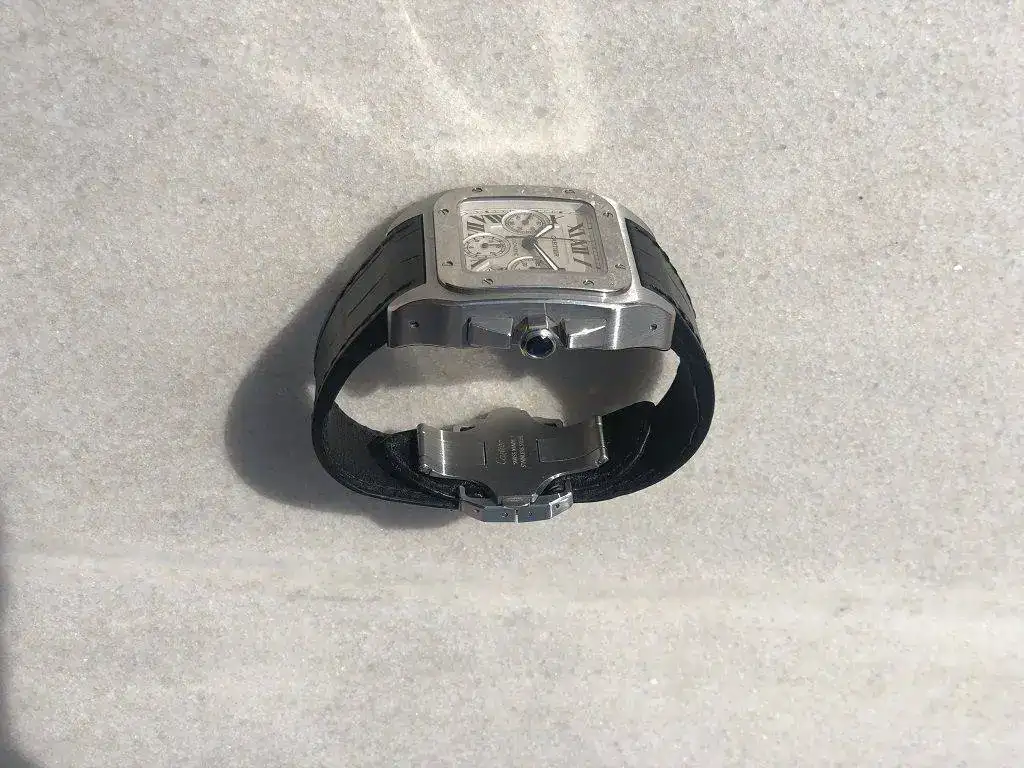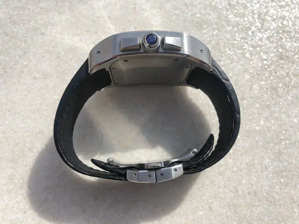 Se trata del conocido Cartier Santos XL Chrono en su versión de acero con correa de cocodrilo negra y cierre deployante.