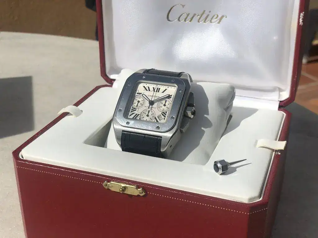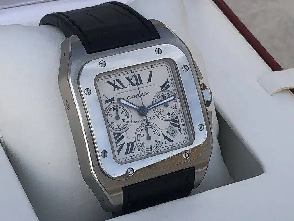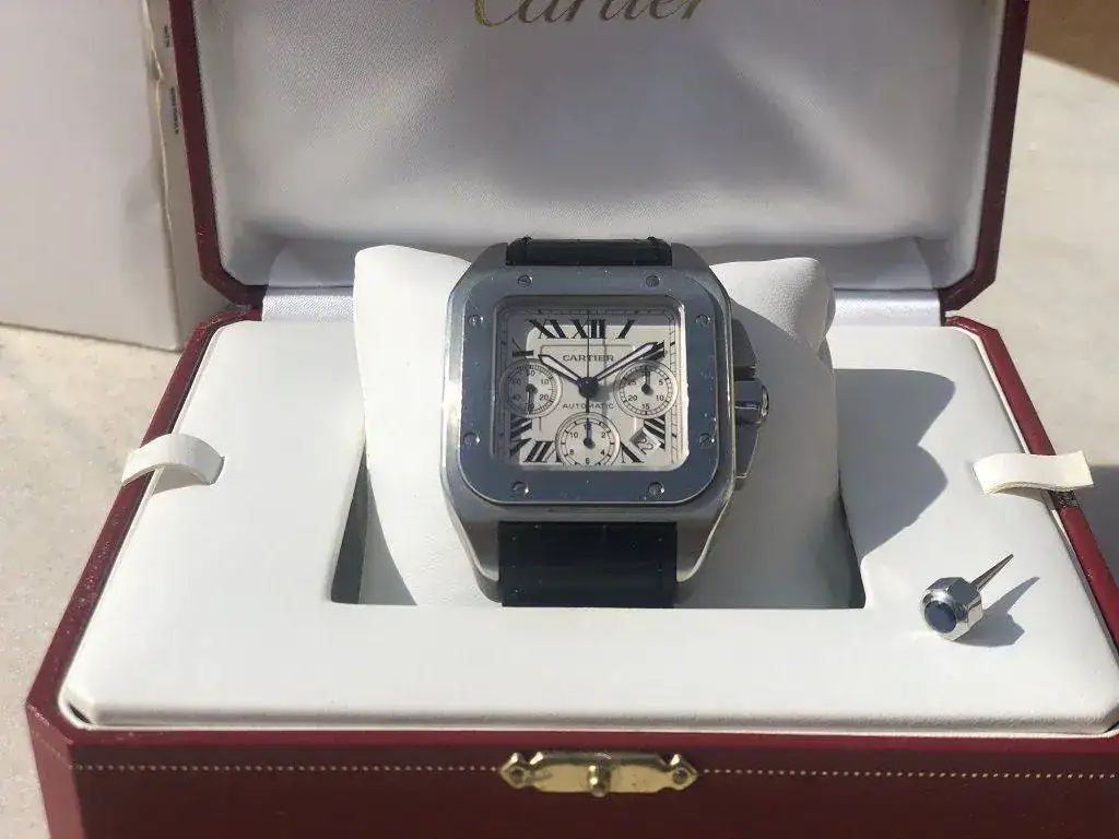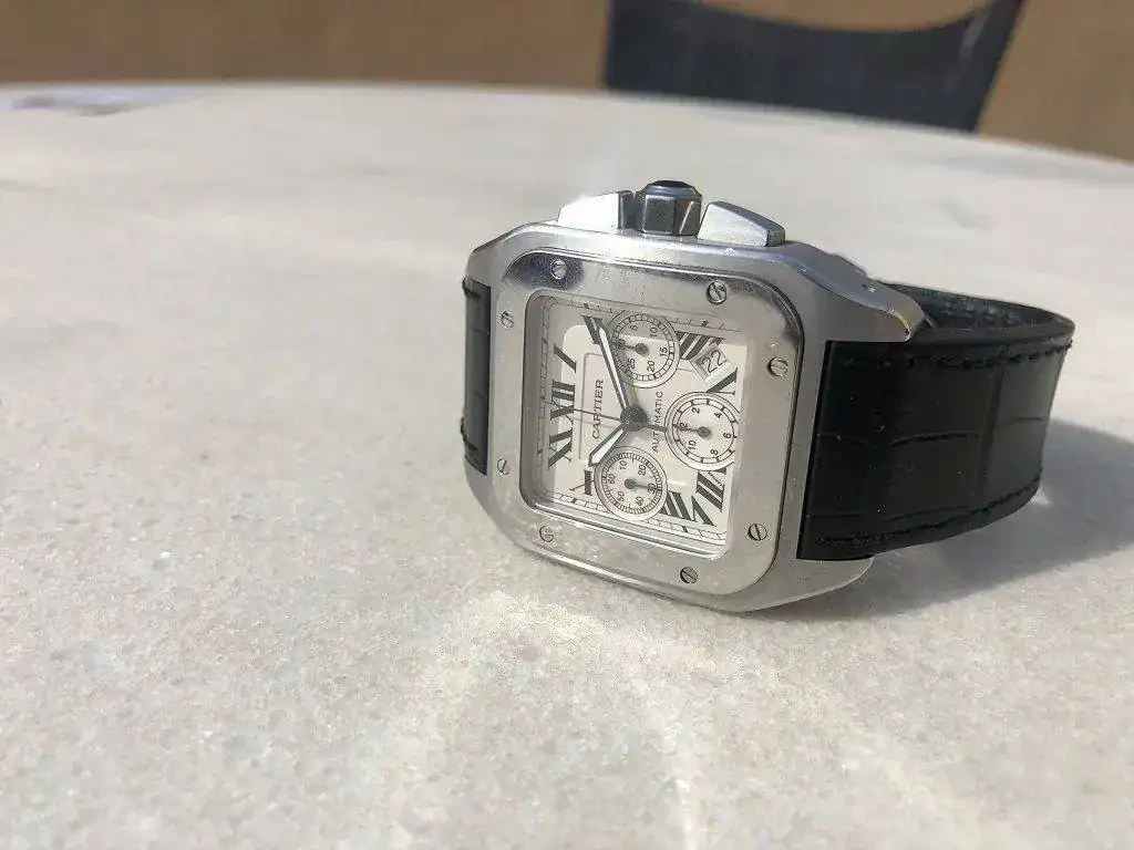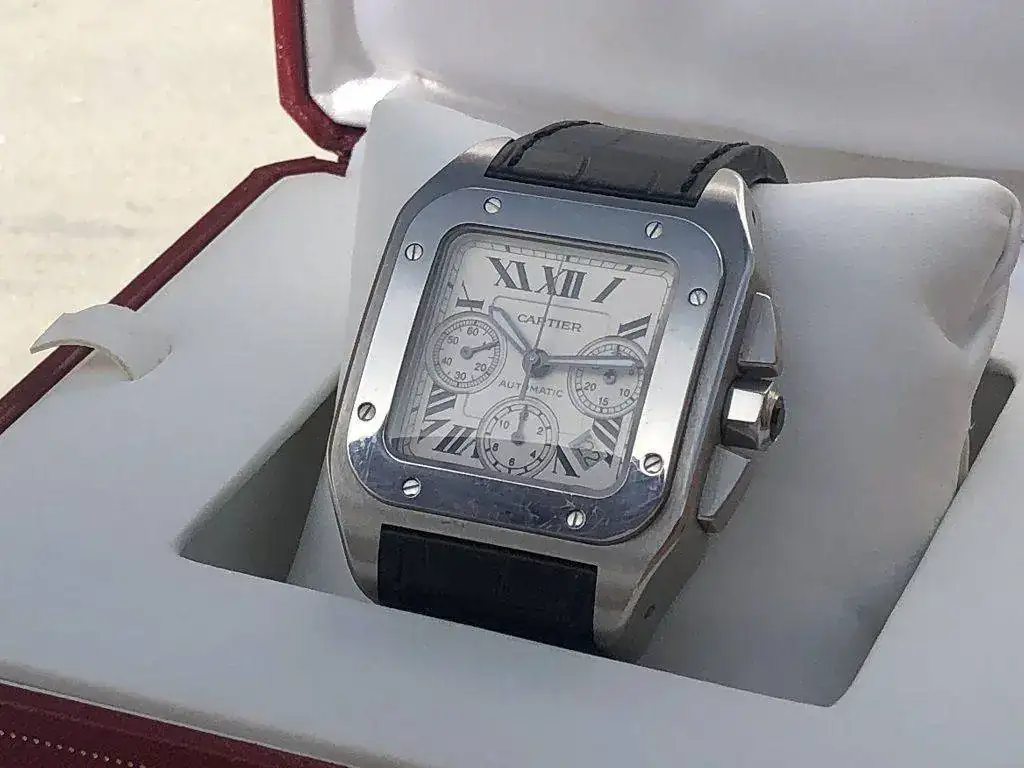 Se trata del conocido Cartier Santos XL Chrono en su versión de acero con correa de cocodrilo negra y cierre deployante.