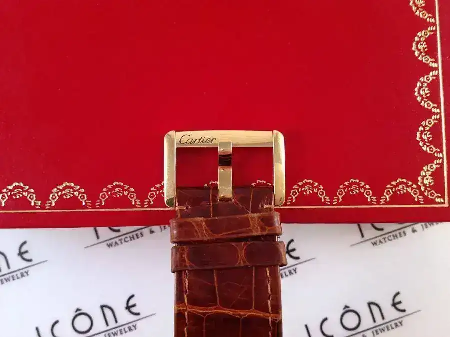 Las características del mismo son: Reloj a cuarzo con caja de oro, brazalete de piel de cocodrilo con hebilla original Cartier, Cristal de Zafiro, sumergible a 50m.