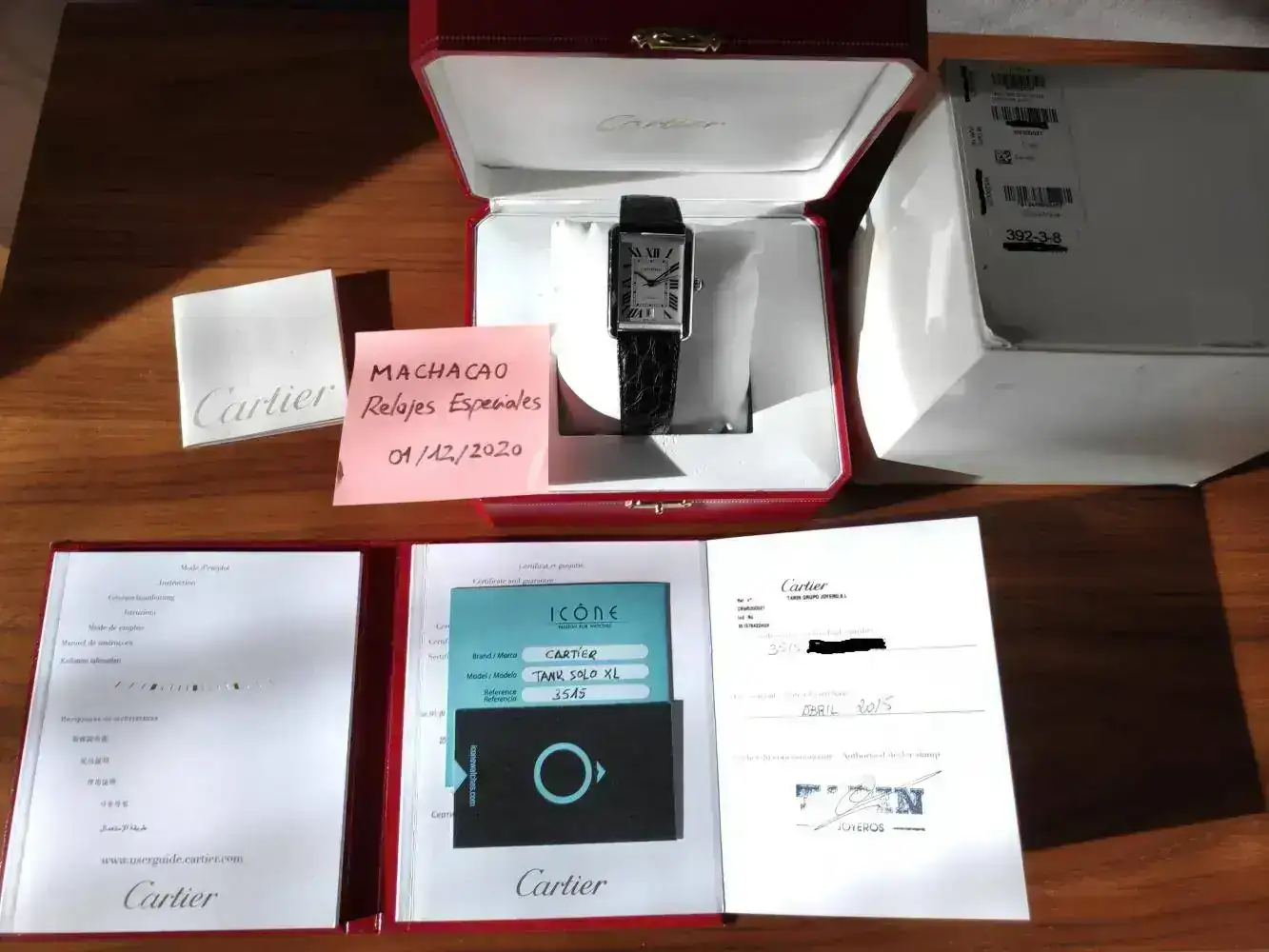 Reloj comprado en mercante NACIONAL en 2019 y completo con toda su dotación compuesta por caja exterior de cartón, estuche guardarreloj de piel roja con logo Cartier, libro de garantía, libro de instrucciones y tarjeta de garantía sellada y fechada en Abril de 2015 (además de la garantía fechada del propio mercante).