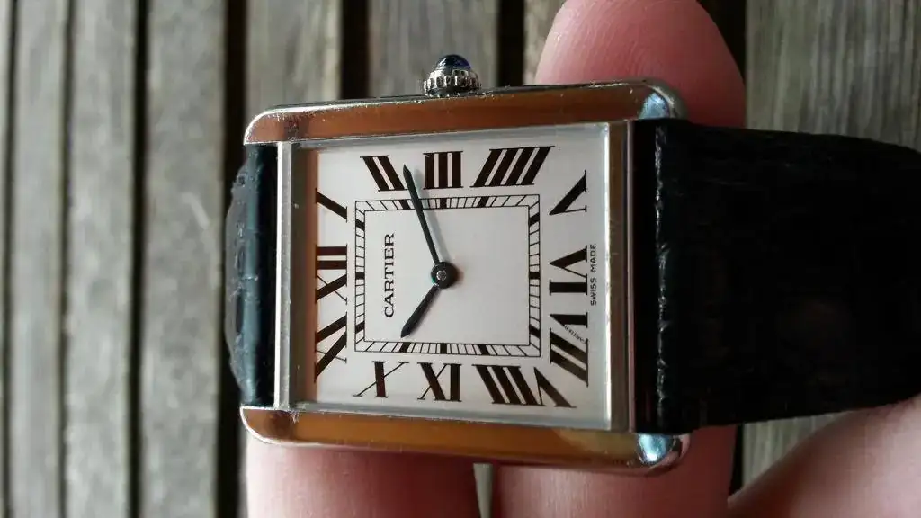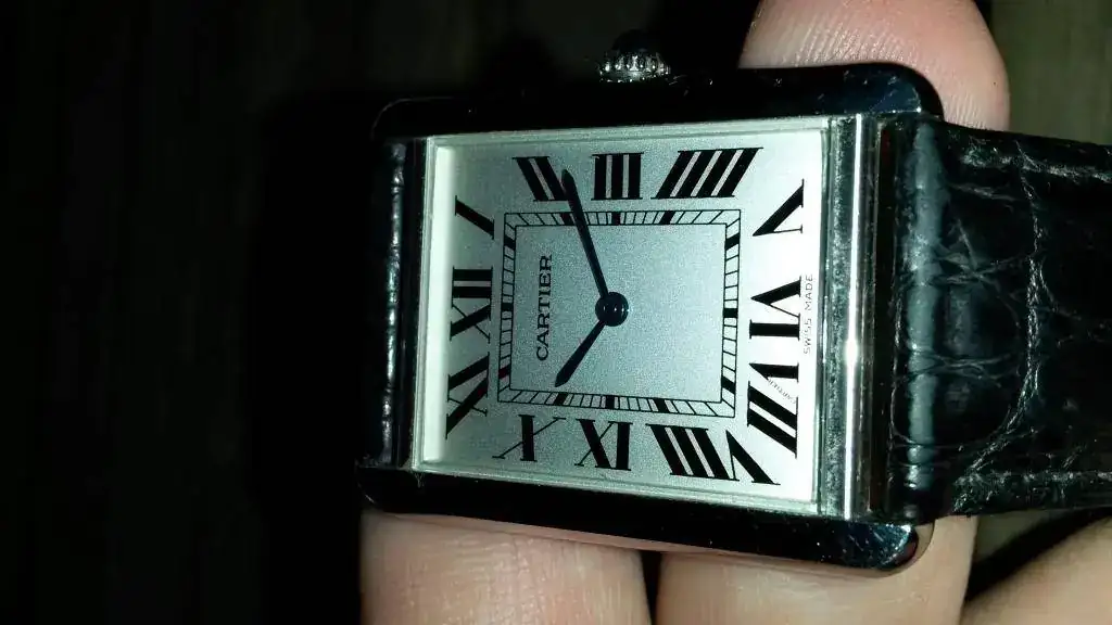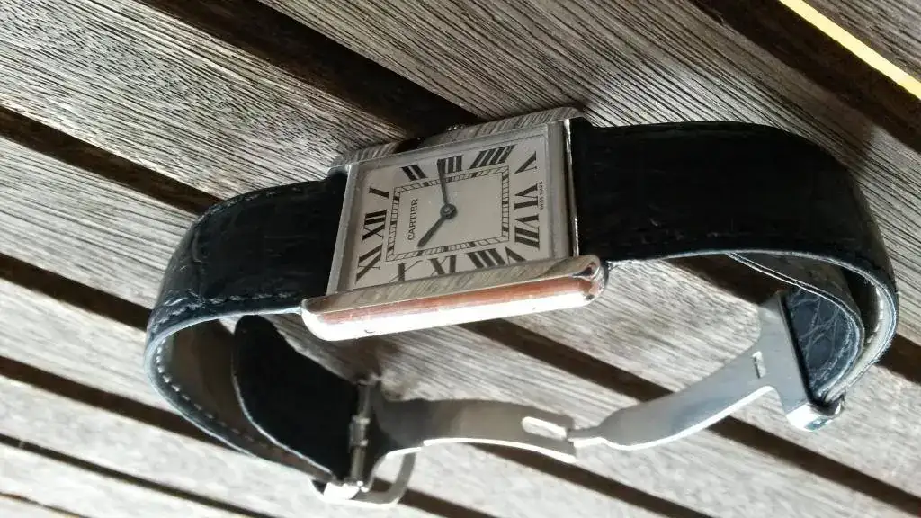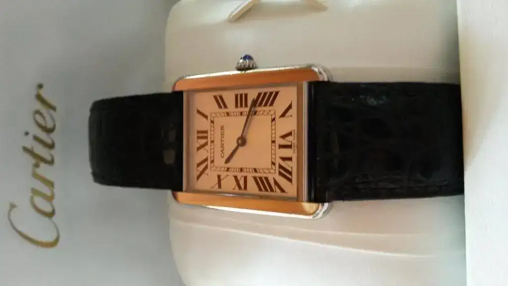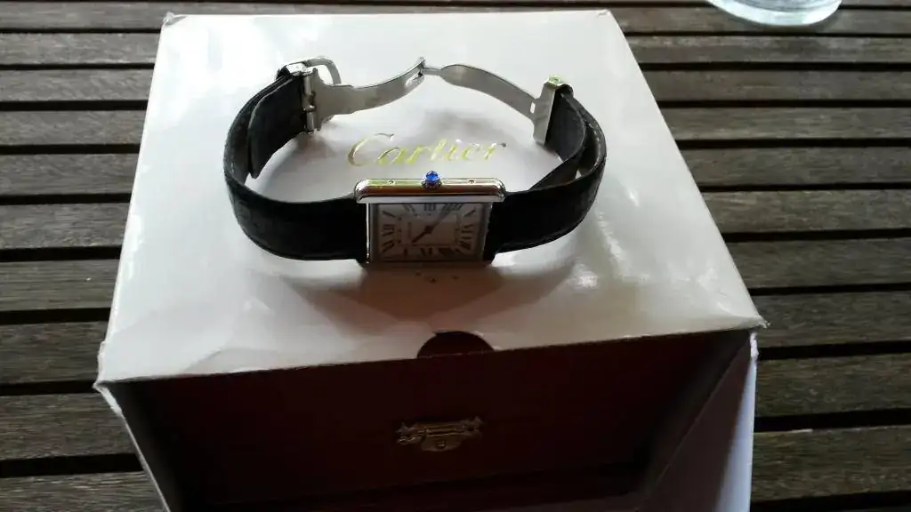 Se trata del modelo Tank Solo de la firma Cartier, el modelo paradigmático de la casa de joyería francesa. La caja del reloj es rectangular, y juntamente con el reverso de Jaeger, son los relojes clásicos de caja rectangular por antonomasia. Asimismo, la caja está configurada por grandes piezas a ambos lados de la esfera que se asemejan a las orugas de los tanques Renault utilizados en la primera guerra mundial, de ahí el nombre que le otorgó a la pieza Louis Cartier cuando la creó en 1917.