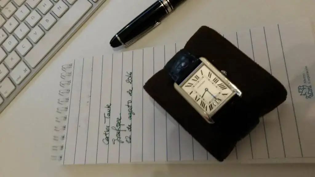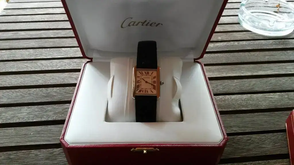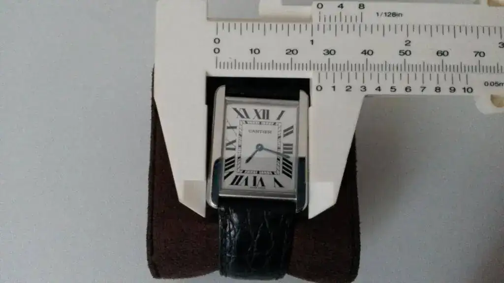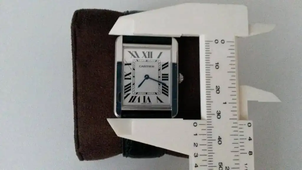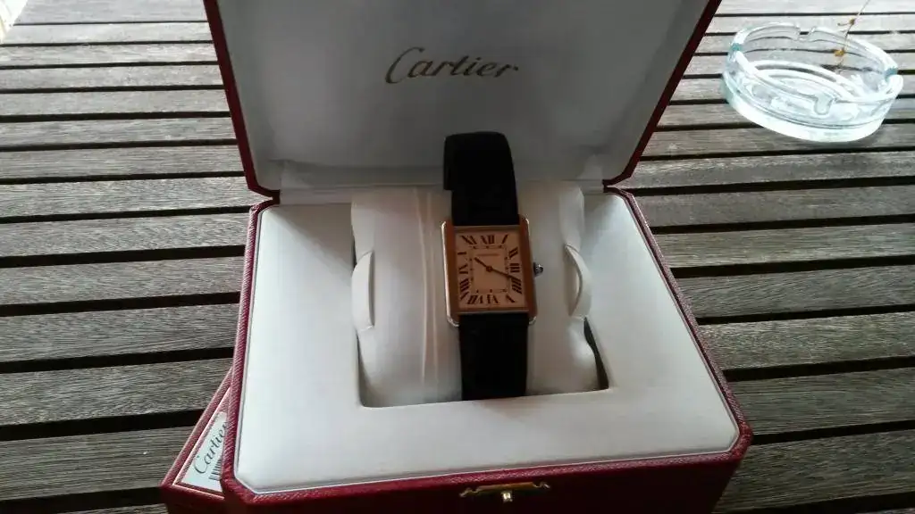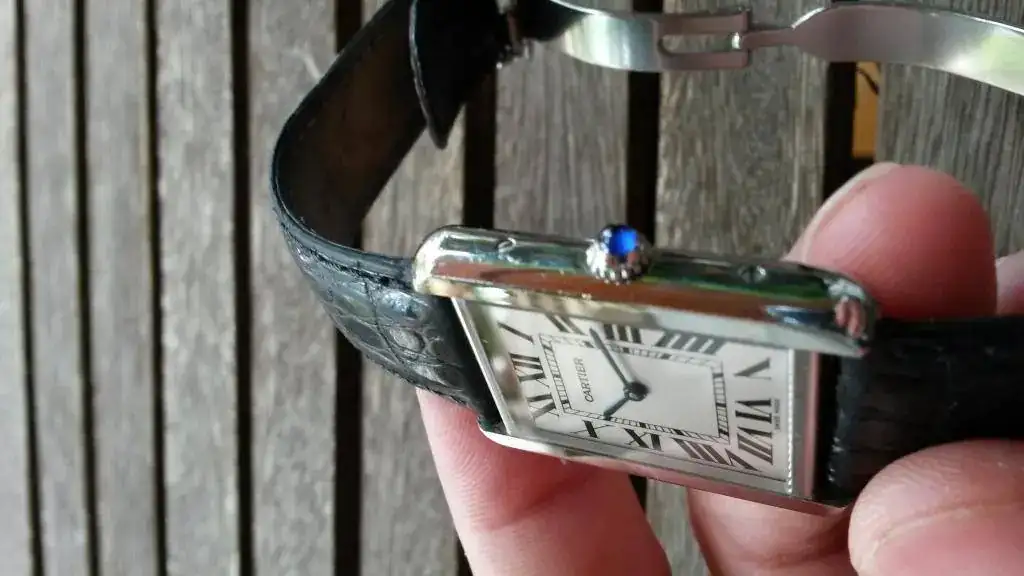 Se trata del modelo Tank Solo de la firma Cartier, el modelo paradigmático de la casa de joyería francesa. La caja del reloj es rectangular, y juntamente con el reverso de Jaeger, son los relojes clásicos de caja rectangular por antonomasia. Asimismo, la caja está configurada por grandes piezas a ambos lados de la esfera que se asemejan a las orugas de los tanques Renault utilizados en la primera guerra mundial, de ahí el nombre que le otorgó a la pieza Louis Cartier cuando la creó en 1917.
