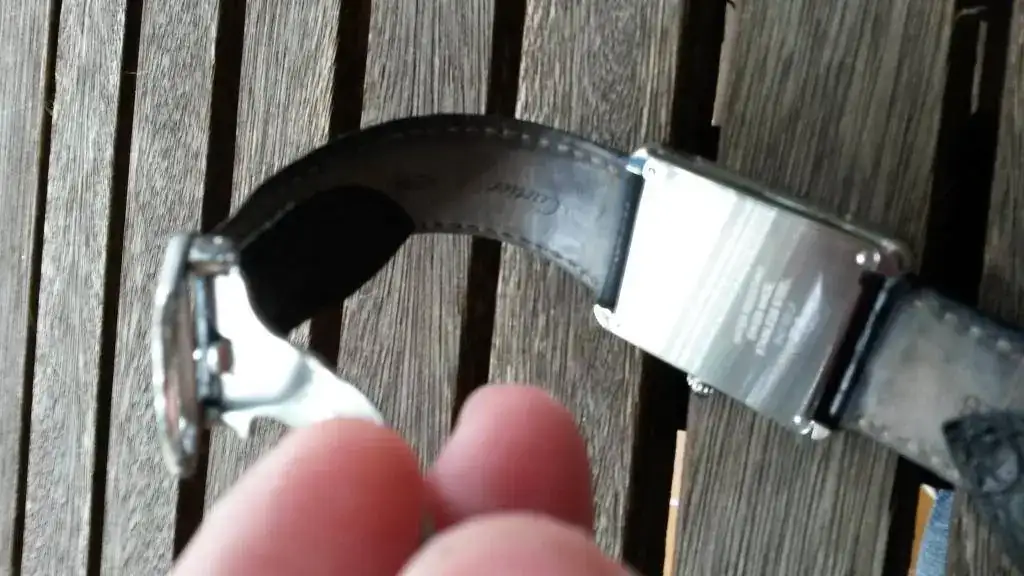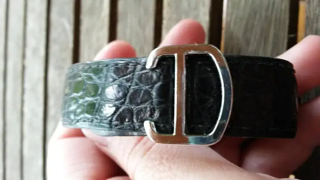 La correa de cocodrilo no tiene costuras y es adaptable a cualquier muñeca dado que gracias al cierre desplegable puede ajustarse al tamaño de forma rápida y sencilla (sin necesidad de herramientas). El cierre está rematado con la característica "C" de la firma; de hecho lleva la nueva "C" de la firma, que ha sido rediseñada y ha sustituido la clásica "C" con la tipografía de Cartier (ver detalle en las fotografías). La correa está usada pero tiene muchísima vida por delante, apenas se nota el uso y, por poner un porcentaje, yo diría que está al 90%