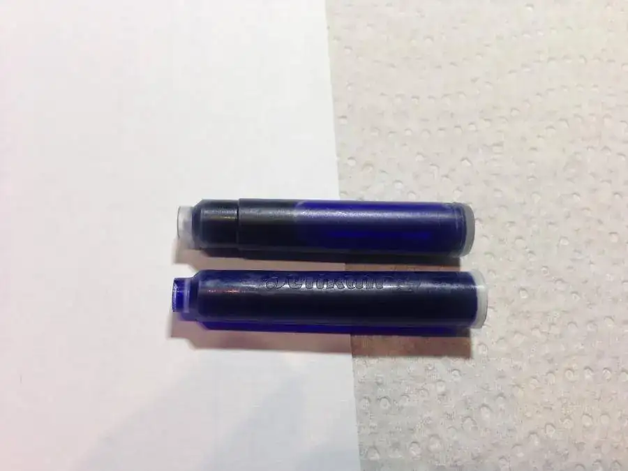 Un tiempo después decidí comprar cartuchos para complementar los 4 que venían con la pluma, y compré unos pelikan 4001. Error. Se sale la tinta. Mirando bien, se parecen, pero no son iguales. El de la Chaumet es un pelin más largo, y tiene un rebaje. En la foto, el de abajo es el Pelikan, y el de arriba es el Chaumet.