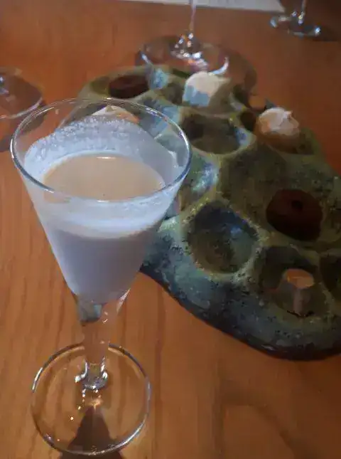 Y para finalizar, cortesía de la casa, chupito de avellana con coñac y dulces variados.