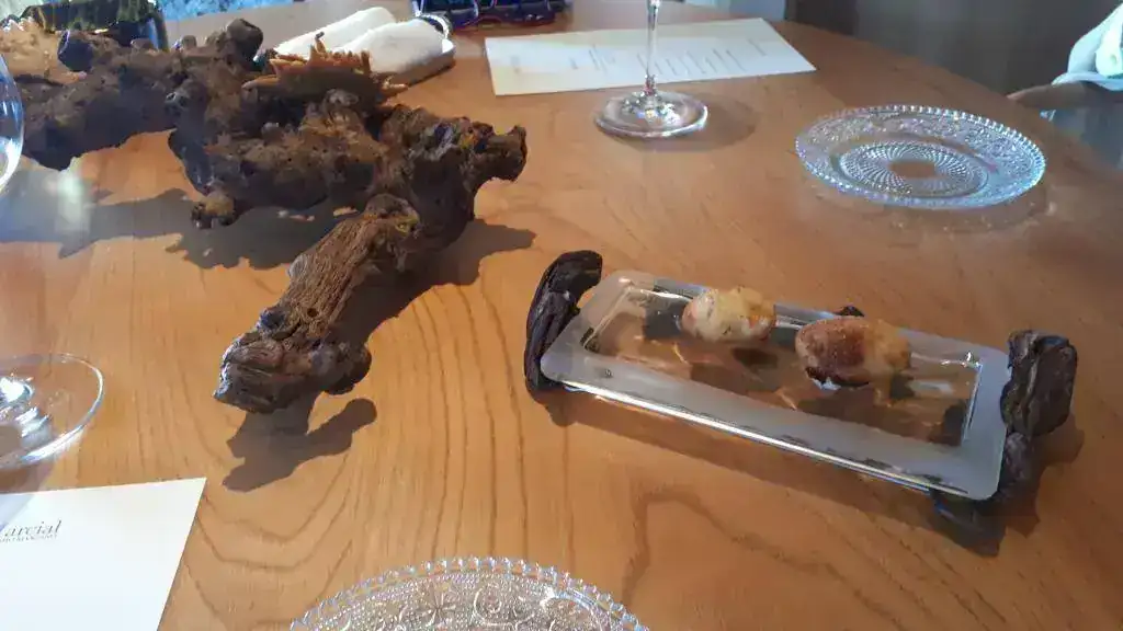 En el tronco, se esconde el snack de crujiente con Foie gras de pollo de corral (pitu caleya)
