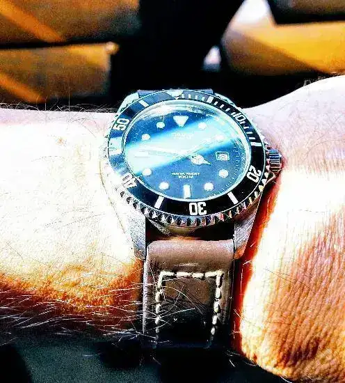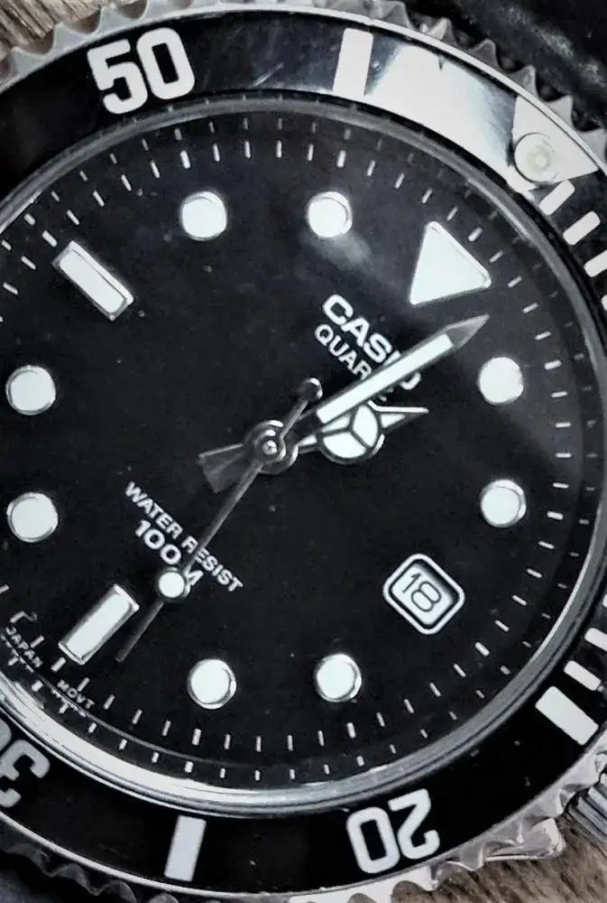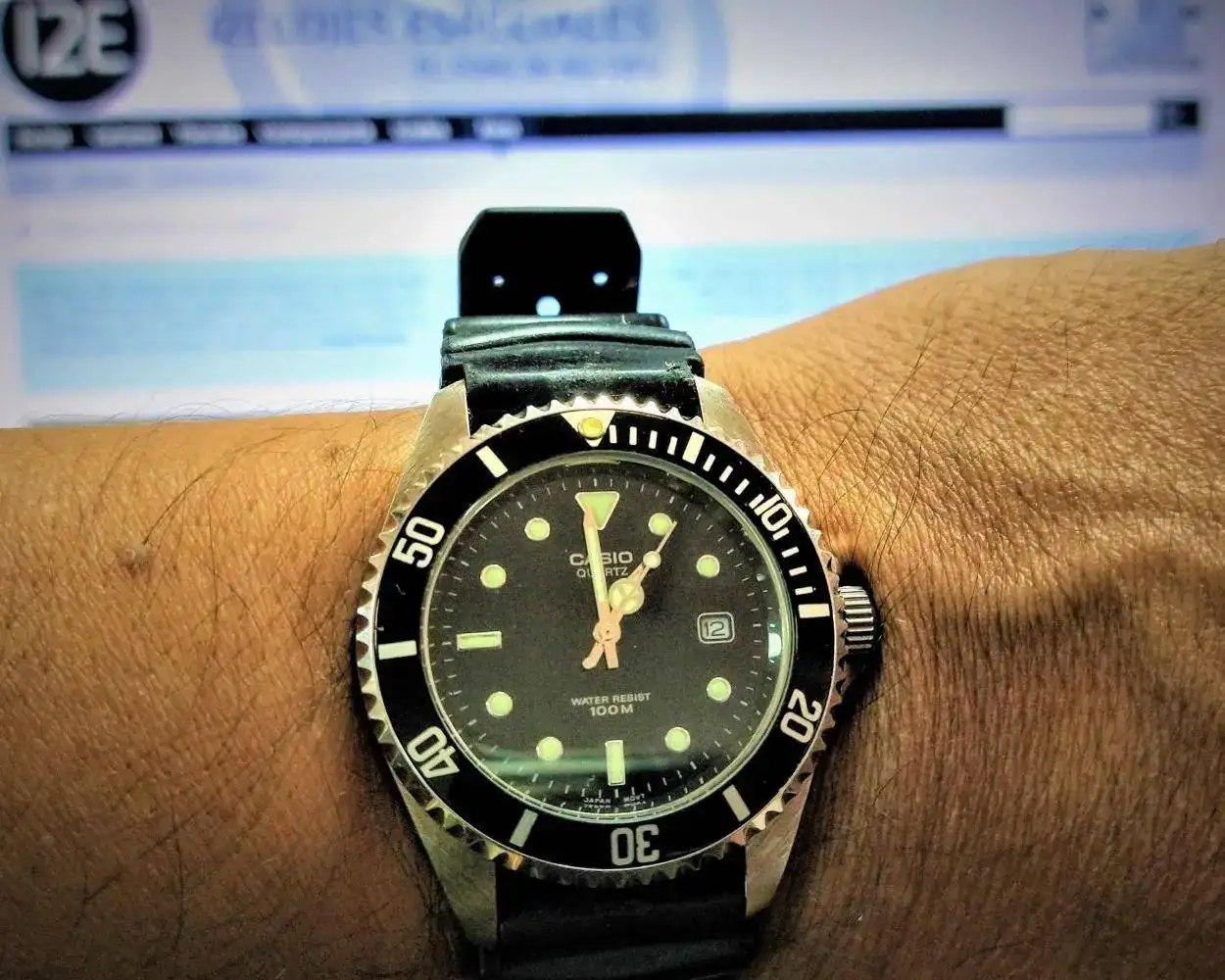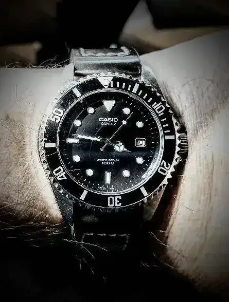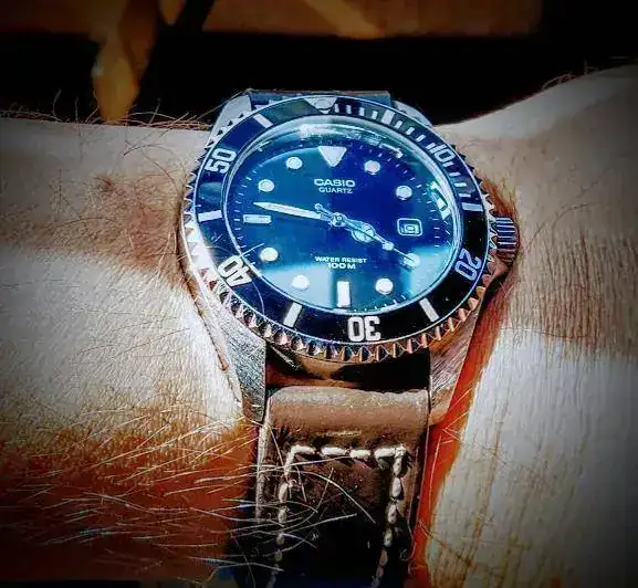 Llegó con una correa negra de goma, muy propia de los Casio (la última foto), pero con el pasar de los días, tras esta publicación, le hice cambios y le coloque una de piel que me parece va con el reloj.