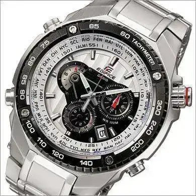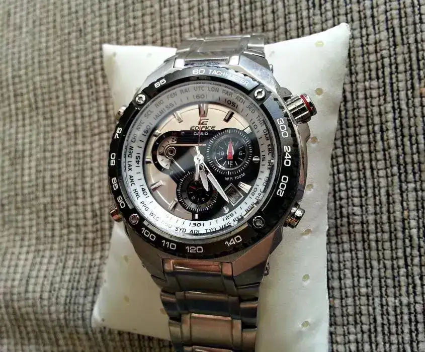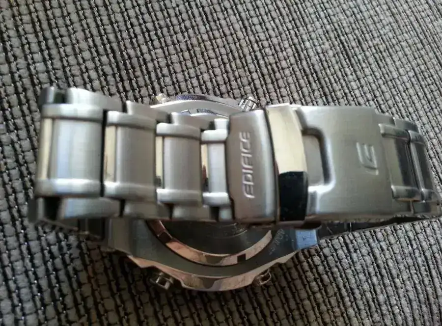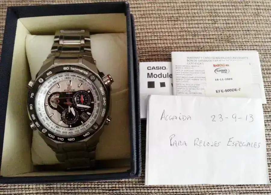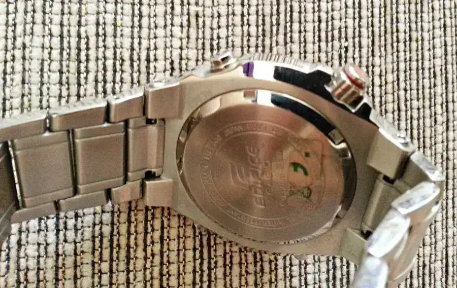 Presento para su venta este magnifico cronógrafo-alarma con cristal de zafiro de Casio Edifice, practicamente de reestreno. Me lo he puesto tan poco que, como se puede observar en una de las imágenes ,aún conserva los sellos transparentes de fábrica en la tapa del reloj.