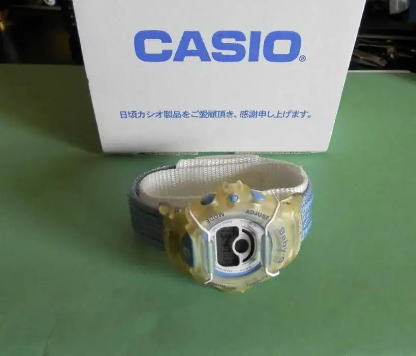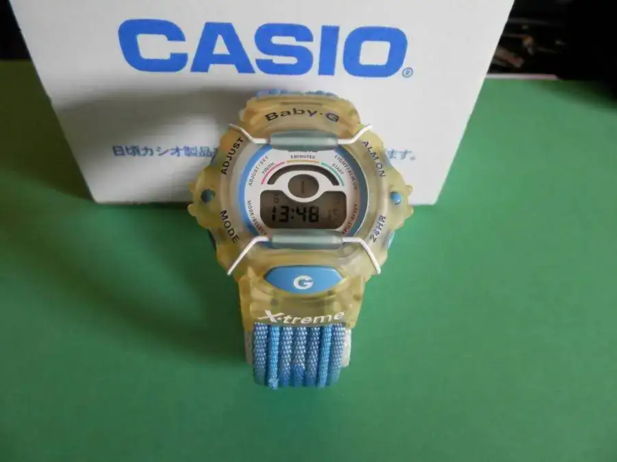 Como reza el título, es un Casio Baby-G modelo BG-340 X-TREME, un modelo poco visto por estos lares (me lo trajeron de Japón hace...ni sé). El reloj en sí está en buen estado, como se puede apreciar por las fotos (se pueden pedir más por privado sin compromiso). La única pega que tiene es que le falta el emblema que reza "X-TREME" en la correa (no sé si se llega a ver bien en la última foto), que se eliminó nada mas llegar (se puede cambiar la correa por otra de nylon, perfectamente). Ha tenido poco trato y funciona correctamente, tanto en el modo reloj como el resto de funciones: alarma, cronómetro, cuenta regresiva, luz...