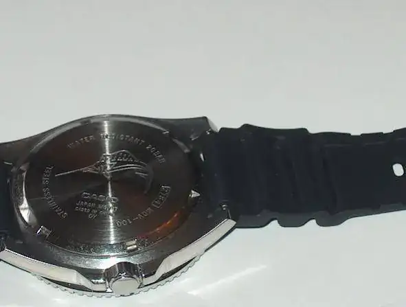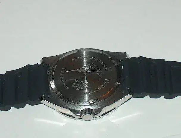 Esta preciosidad monta corona y trasera, ambas roscadas. Ah! Y nada de plexi sino cristal mineral resistente a rayaduras. ¿Quién ofrece tanto por tan poco? destaca el fondo decorado con el mítico pez MARLIN. Casio decidió utilizar este famoso dibujo del pez. La propia Casio, en el lanzamiento de sus Duro "marlin" lo explica y traduzco: