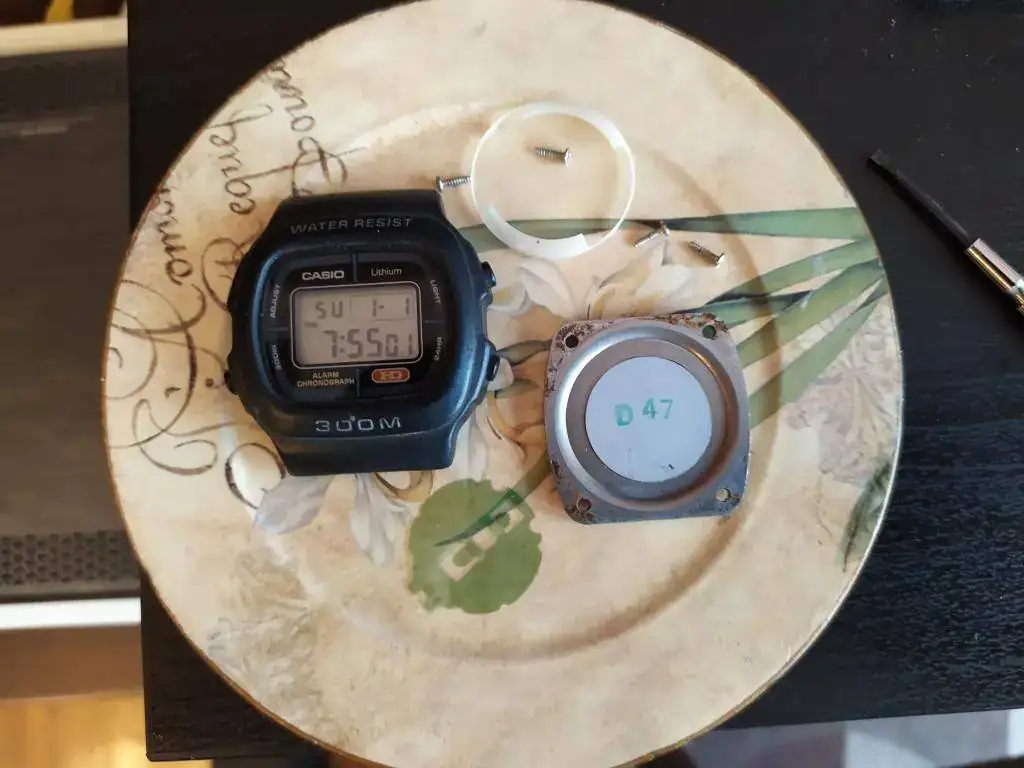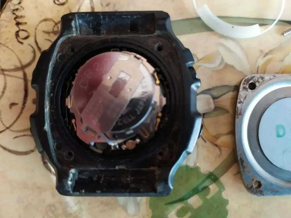 Guiado por esta fiebre que me aqueja últimamente, he rescatado de casa mi padre (o sea, de la casa donde viví la infancia) lo que restaba de un viejo Casio DW 300 regalo de un amigo suyo, esto es, la carcasa y la maquinaria con su batería agotada desde sólo sabe Dios cuando. Se trata de un Casio con armazón de Diver (prometía ser sumergible a 300 m) y con un parentesco evidente con los posteriores G-SHOCK.