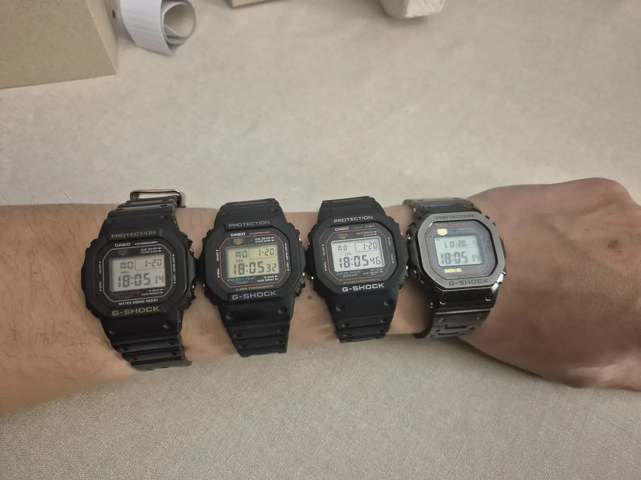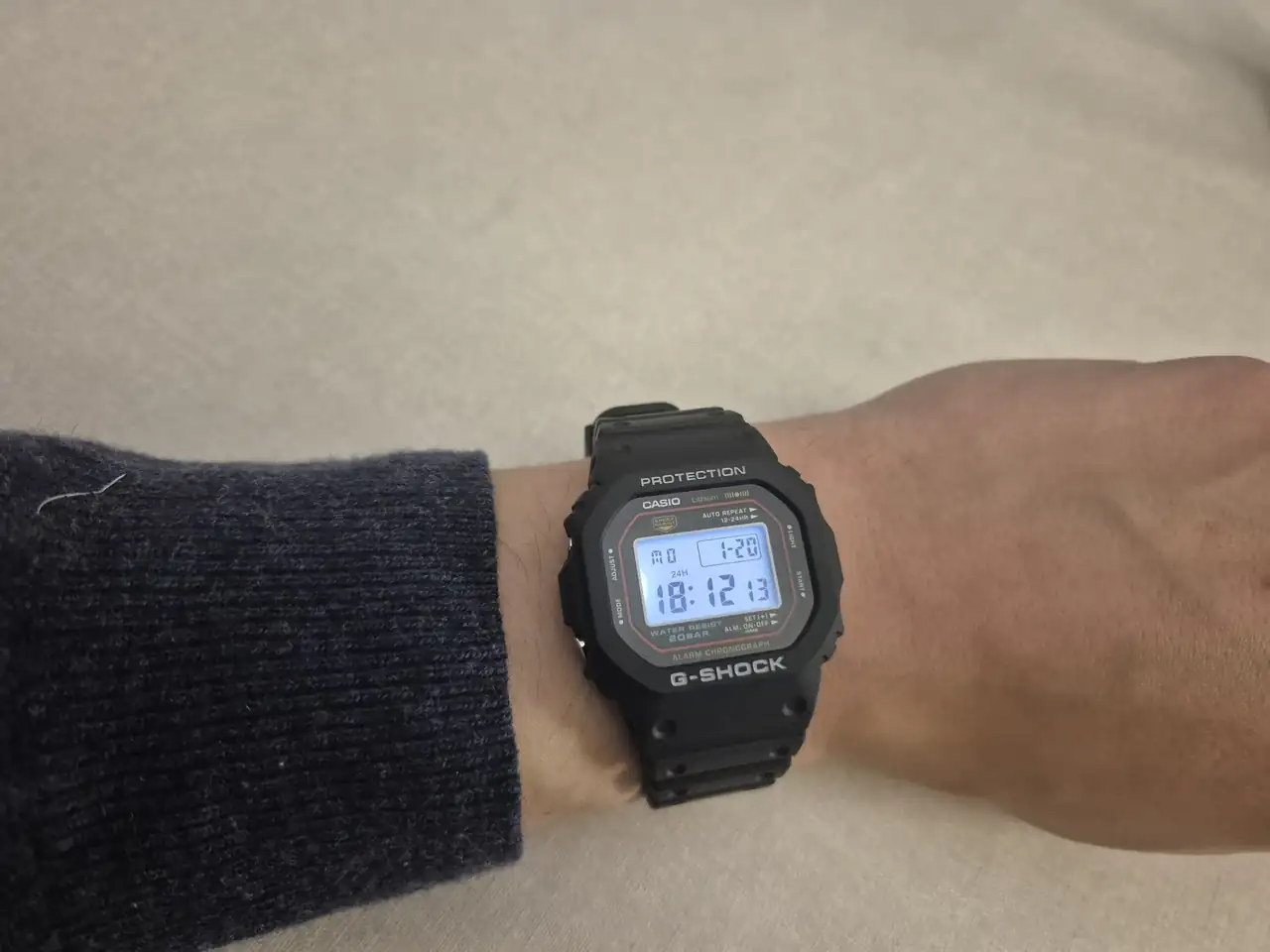 Siendo más radical, me habría gustado incluso que hubiese tenido el viejo sistema de ir pasando los minutos de cifra en cifra individualmente, y los avisos sonoros de progreso del crono y la cuenta atrás cada 10 minutos. O la alarma larga de 30 segundos de aquellos módulos antiguos, que si además suena a un buen volumen, no como en el 5610, pues es una verdadera alarma despertador. Son esas cosas llenas de encanto para quien los usa hoy día, que tienen los Casio antiguos como los Marlin con módulo 106 o 248, y que tenía el módulo 240 del 5000C original. El módulo 240 tenía también una cuenta atrás demasiado básica, y un cronógrafo también bastante corto, en comparación con simplemente los de un DW-5600C o DW-5600E. Son cosas que mejoraron mucho al sustituir el módulo 240 del primer G por el 691 del 5600C, que también llevaban los DW-240HD y familia. Pero al menos los bips de medias horas sí le podían haber puesto a este nuevo. Para mí, un reloj que pretende ser como el original, y estéticamente lo consigue en gran medida, perdería todo el encanto con las modernidades de la energía solar y el radio control, mientras que habría tenido más encanto con esos detalles añejos en el funcionamiento que tanto nos gustan a los que tenemos en nuestra colección algunos vintage. De hecho, escribiendo esto me acaban de entrar unas ganas tremendas de irme a por mi Marlin H-101 o el W-24 o el W-36, para usarlos un poco y oir su precioso sonido antiguo.