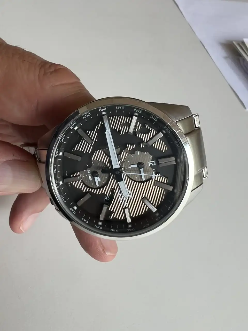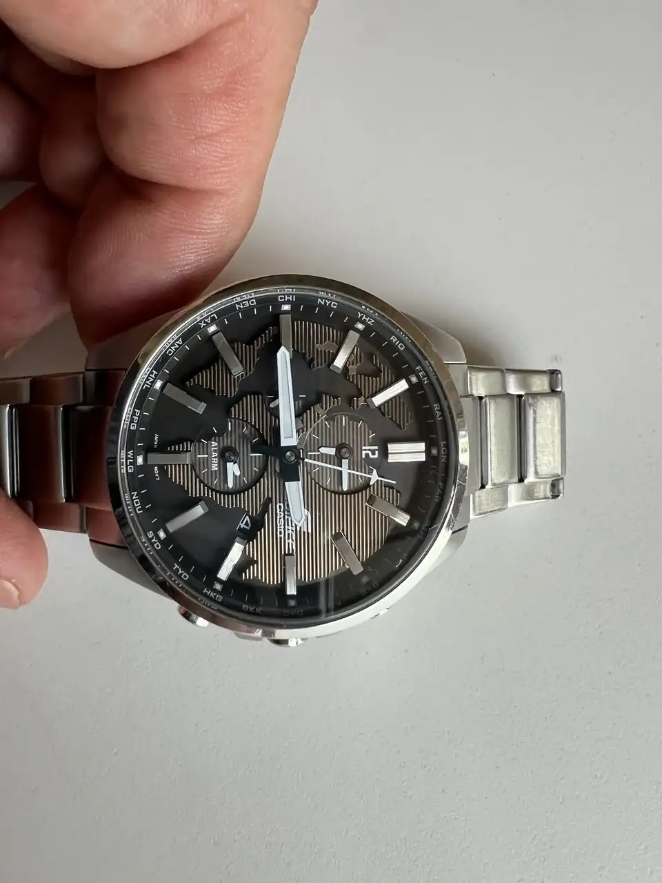 · Dos esferas (hora mundial 12 horas y alarma 12 horas) y día del mes.