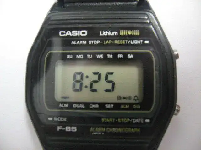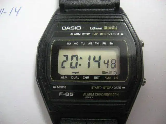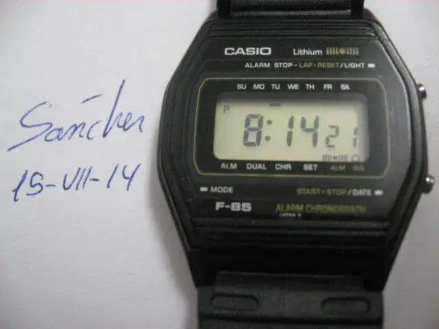 Hoy saco a la venta un recuerdo de los 80´. Se trata de un Casio F85 precursor de los muy comunes F91W de hoy. De tamaño es similar por no decir igual. Tiene distintas funciones y todas operativas: hora (am y pm), hora dual (24h), alarma, crono y luz y repito todas operativas. Lleva una correa genérica de calidad más que aceptable. El estado es bastante bueno salvo unos “frenazos” a las ocho en el plexi que se podrían pulir y los botones que perdieron algo de cromado. A diferencia de los actuales Casios económicos, este lleva la tapa a presión con unas marcas en tapa y caja para su correcto cierre. La pila fue cambiada no hace ni dos meses. Ah, y este no es ni Water Resist, pero como algunos ya sabéis yo no mojo los relojes.