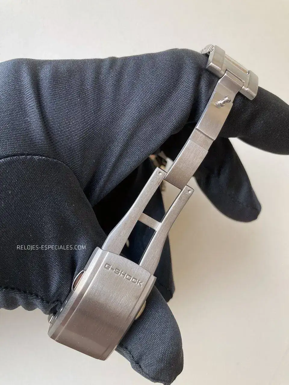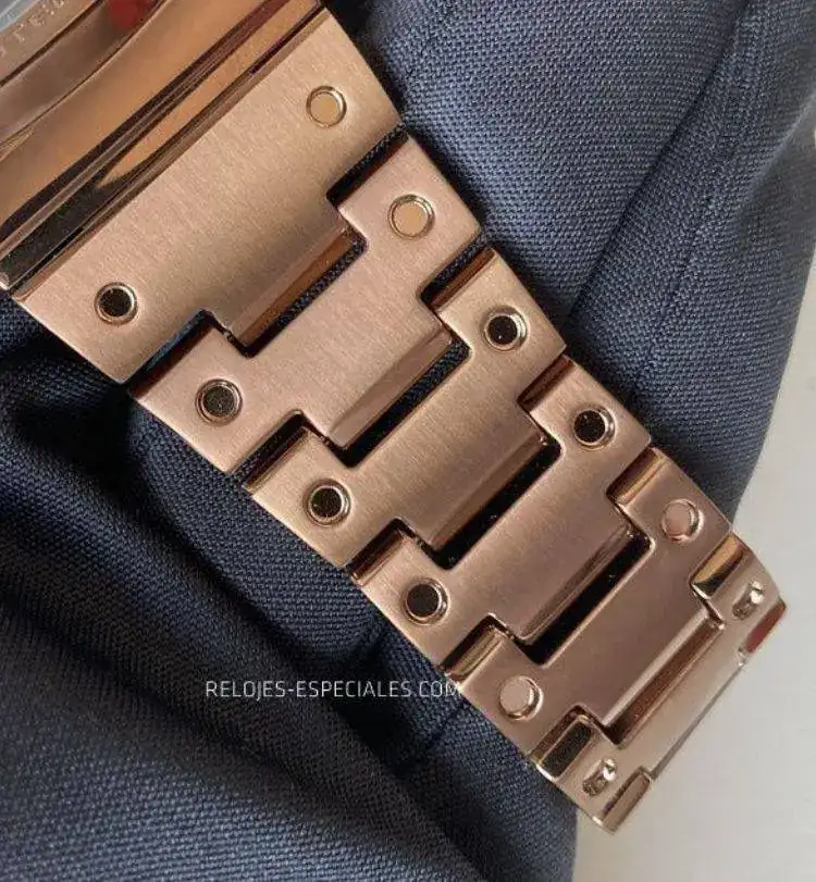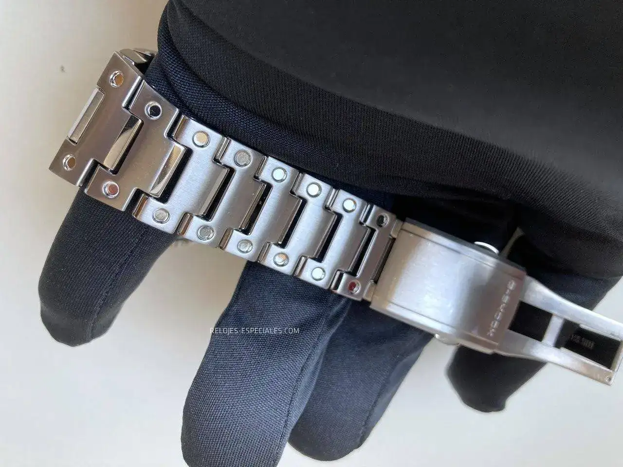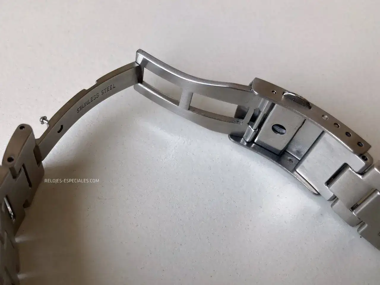 Los huecos entre los eslabones son considerables, o eso me ha parecido a mí, y tiendo a pensar que el motivo sea evitar que pellizquen los pelos de la muñeca del usuario. Los estampados en ellos simulando tornillos están tan pulidos que parecerían espejos, contrastando con el ligero cepillado de los propios eslabones y cierre de doble pulsador que, por cierto, presenta un bonito motivo decorativo.